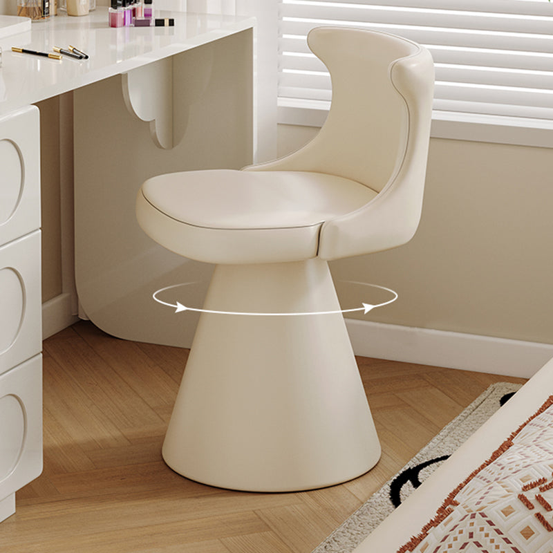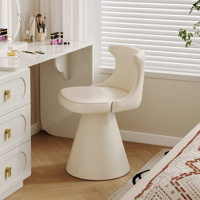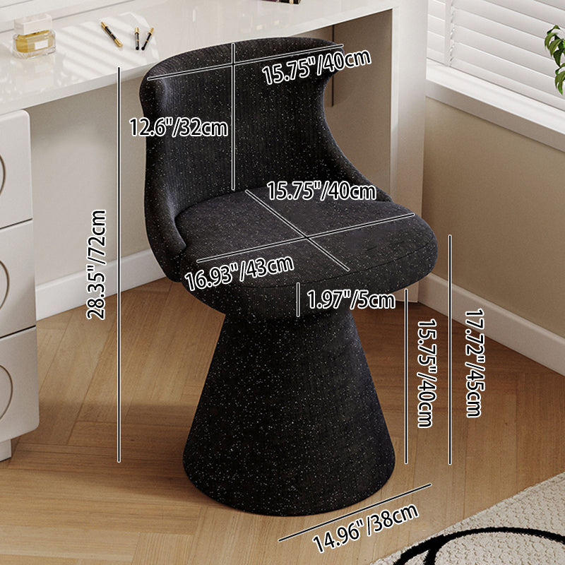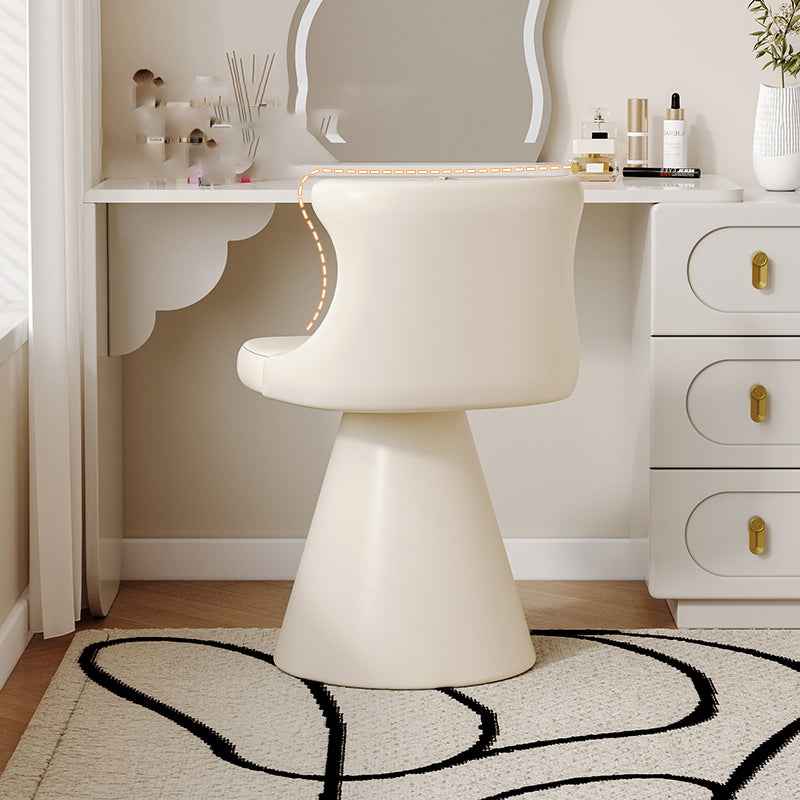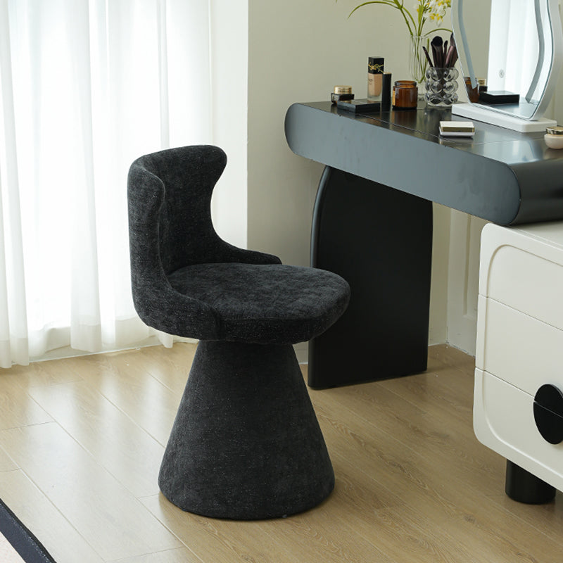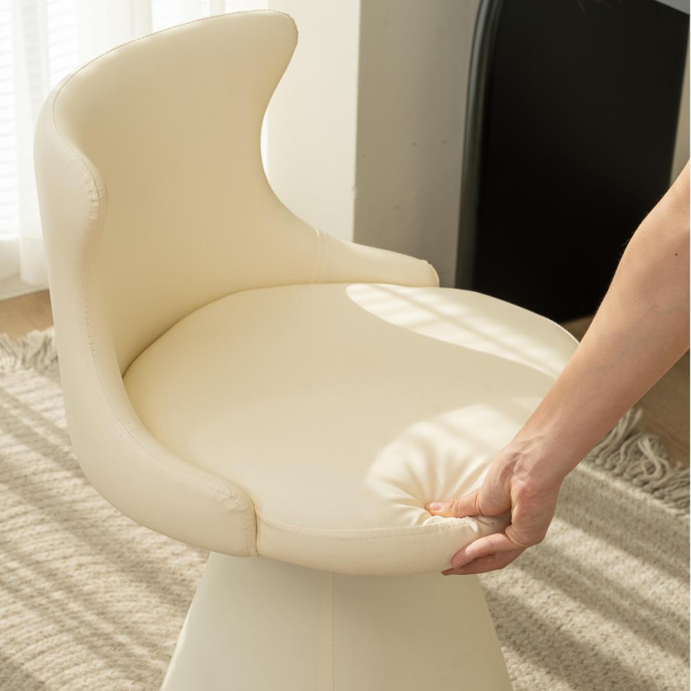 This modern luxury swivel vanity chair features a solid wood plywood frame, a wraparound ergonomic backrest, and a space-saving tapered base. Upholstered in scratch-resistant faux leather or soft chenille, available in Cream White and Black Galaxy, it offers stylish comfort for bedroom vanities, makeup stations, and small spaces.
