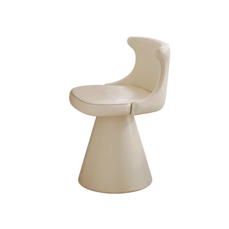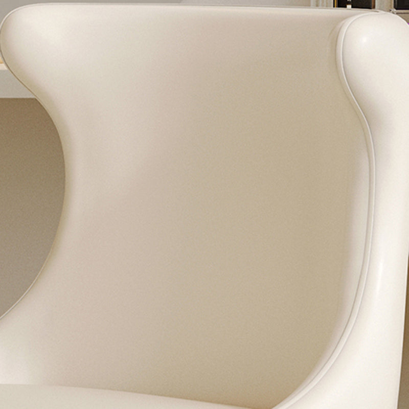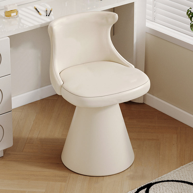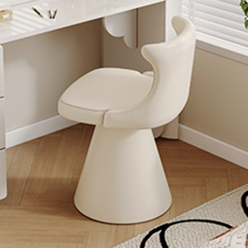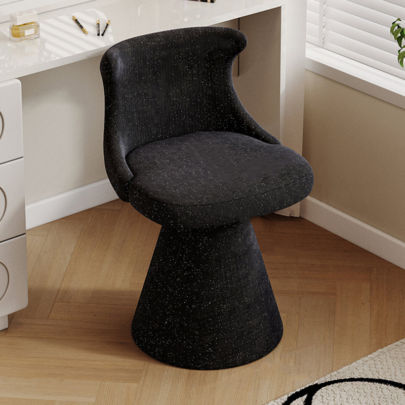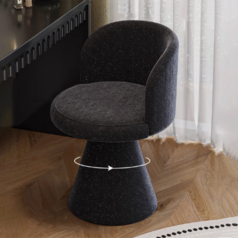 This modern luxury swivel vanity chair features a solid wood plywood frame, a wraparound ergonomic backrest, and a space-saving tapered base. Upholstered in scratch-resistant faux leather or soft chenille, available in Cream White and Black Galaxy, it offers stylish comfort for bedroom vanities, makeup stations, and small spaces.