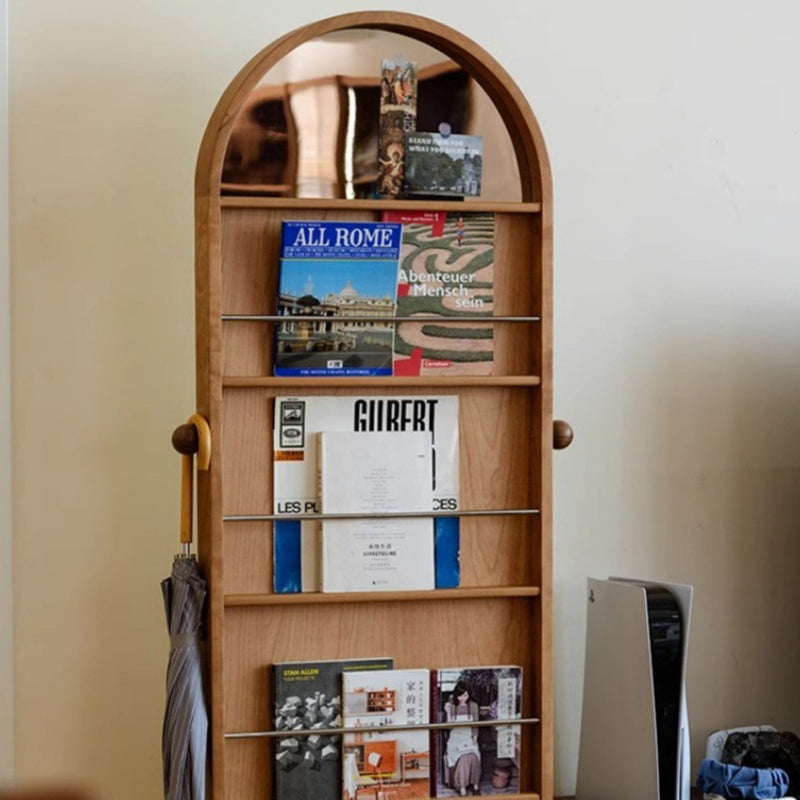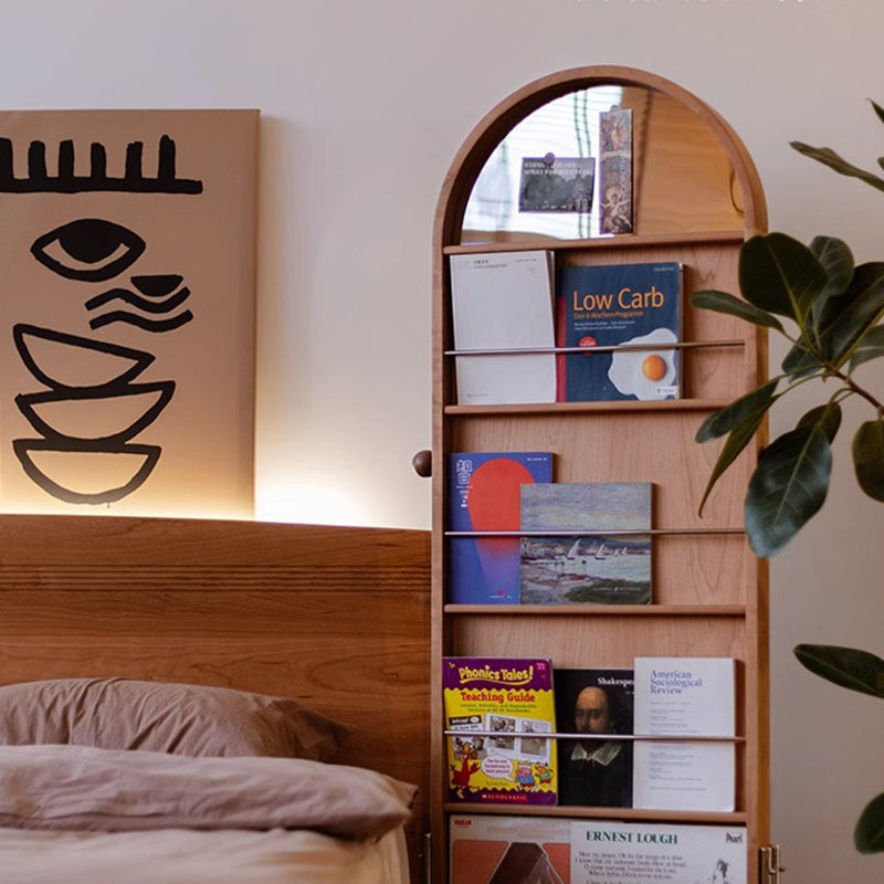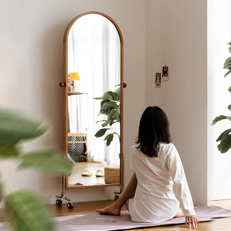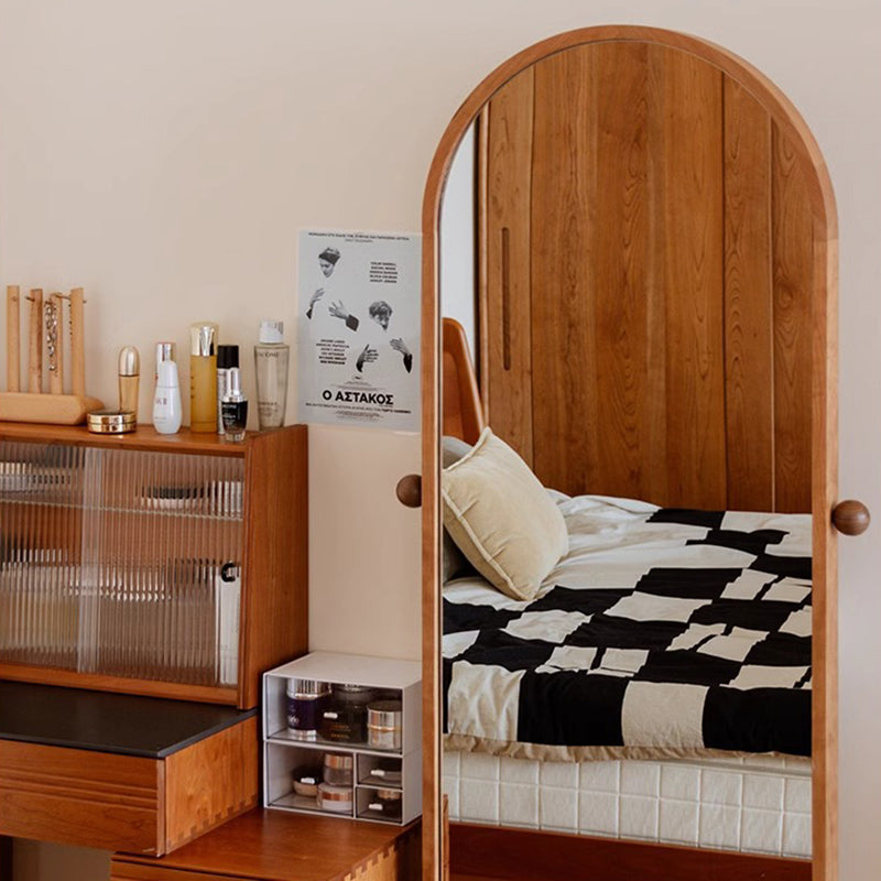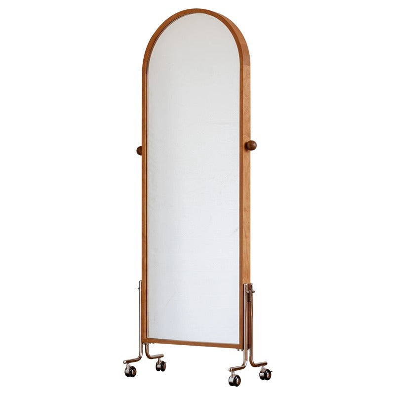 Elevate your space with this modern arch full-length mirror, a unique blend of natural materials and practical design. The frame elegantly combines North American cherry wood with striking walnut accents and a sturdy iron structure. Functionality is built in with a compact walnut-finished 4-tier storage rack and strong spherical walnut hooks. Designed for convenience, it features a slim footprint and 360° swivel casters for effortless mobility, making this movable, magazine-style dressing mirror a stylish and functional centerpiece for any bedroom.