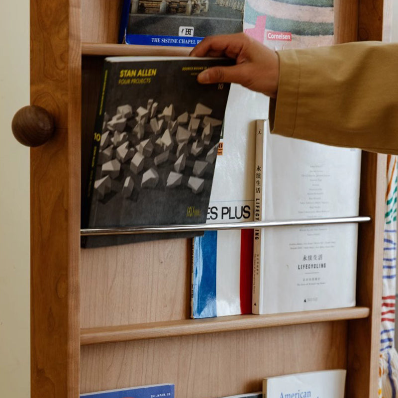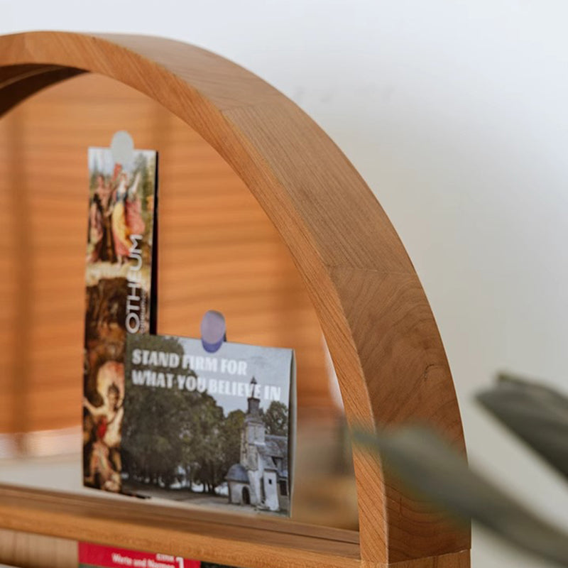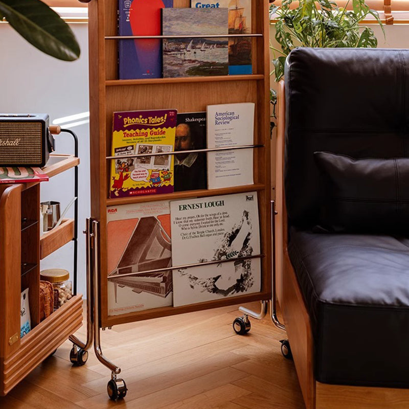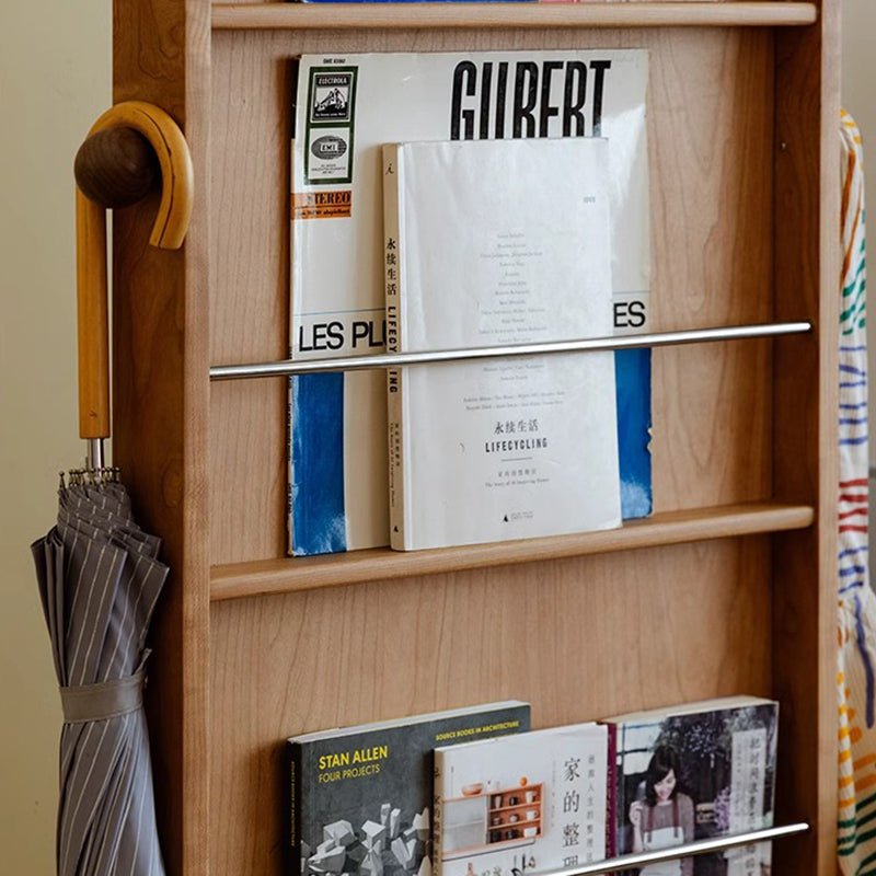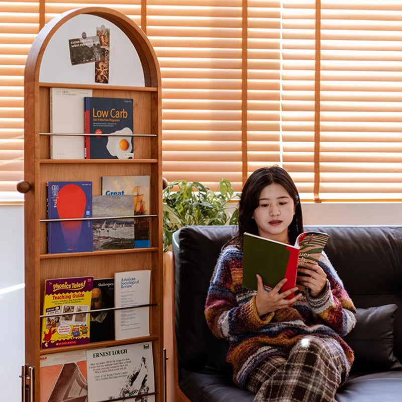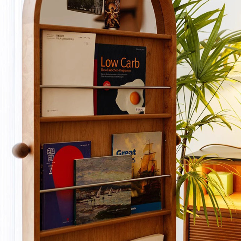 Elevate your space with this modern arch full-length mirror, a unique blend of natural materials and practical design. The frame elegantly combines North American cherry wood with striking walnut accents and a sturdy iron structure. Functionality is built in with a compact walnut-finished 4-tier storage rack and strong spherical walnut hooks. Designed for convenience, it features a slim footprint and 360° swivel casters for effortless mobility, making this movable, magazine-style dressing mirror a stylish and functional centerpiece for any bedroom.