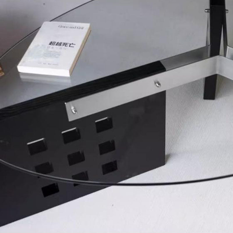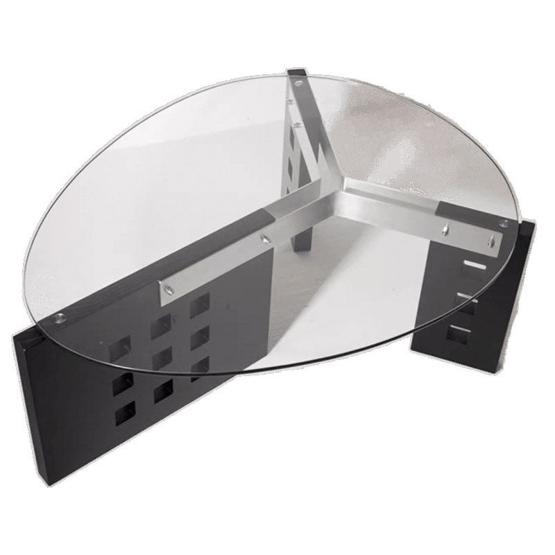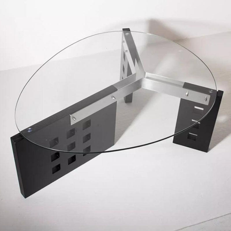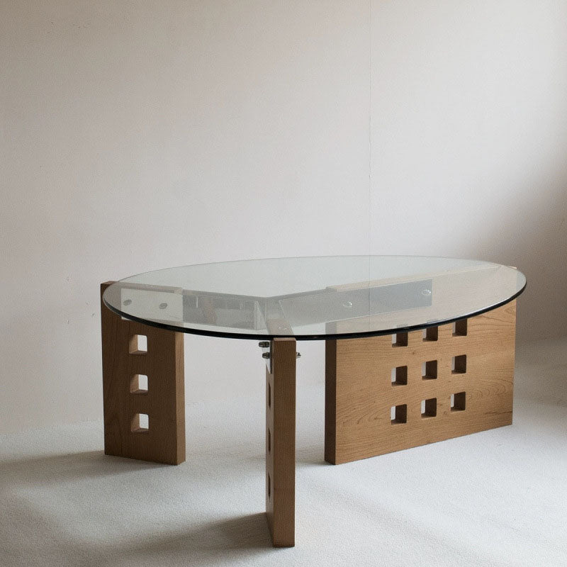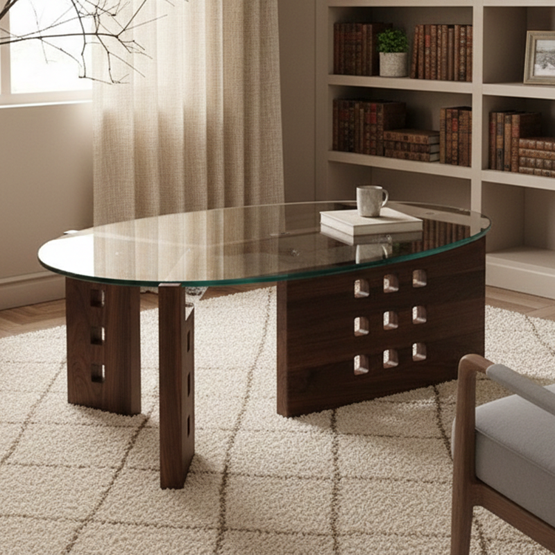 Featuring an oval tempered glass tabletop and a sculptural perforated base, this modern minimalist coffee table combines style and functionality. Crafted with tempered glass, solid wood, and stainless steel, it offers a single-tier open design and easy mobility, available in vintage brown, black, and walnut finishes—perfect for contemporary living rooms or casual conversation areas.