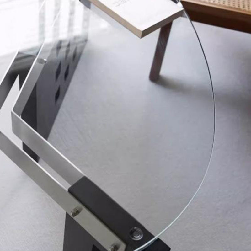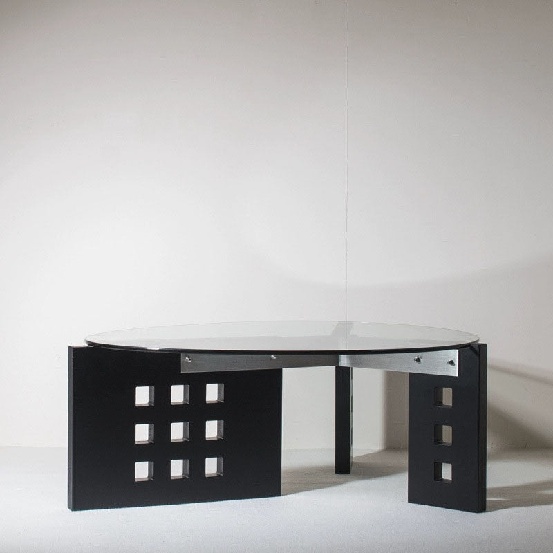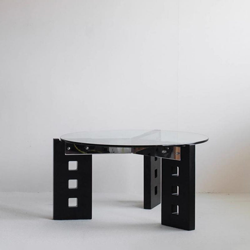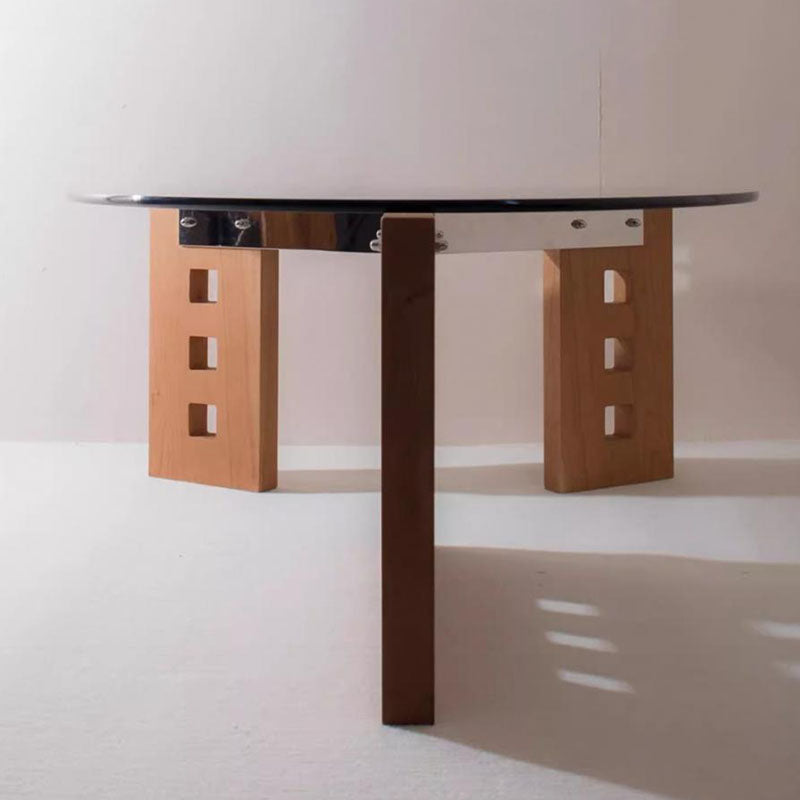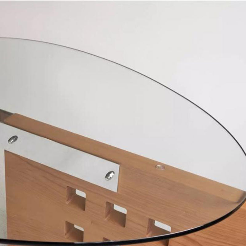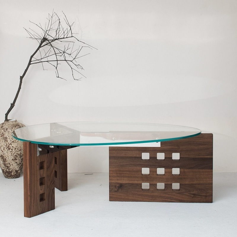 Featuring an oval tempered glass tabletop and a sculptural perforated base, this modern minimalist coffee table combines style and functionality. Crafted with tempered glass, solid wood, and stainless steel, it offers a single-tier open design and easy mobility, available in vintage brown, black, and walnut finishes—perfect for contemporary living rooms or casual conversation areas.
