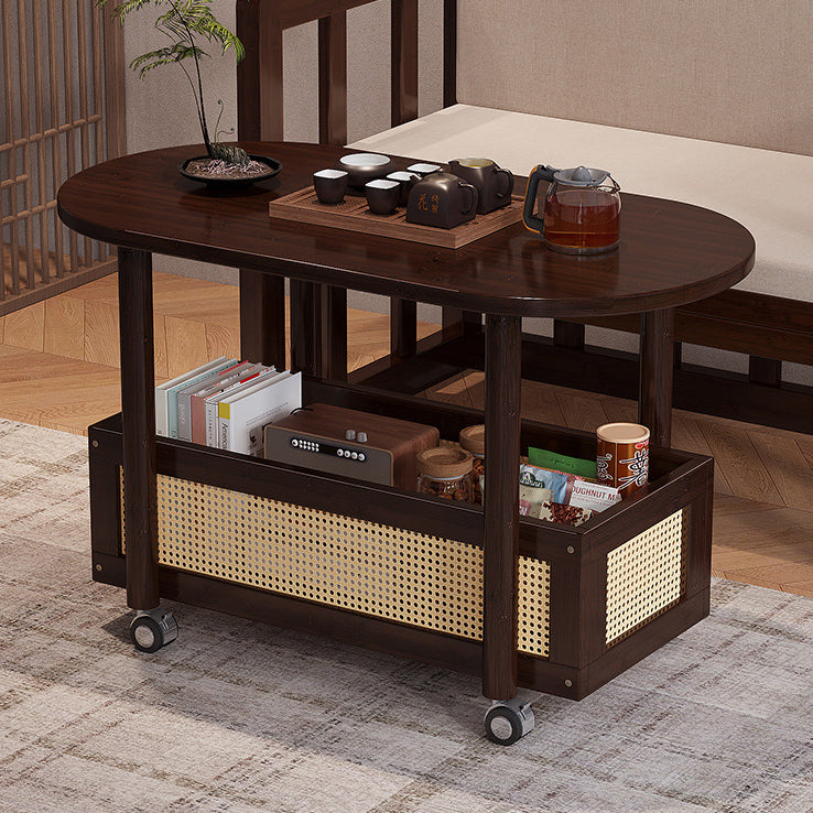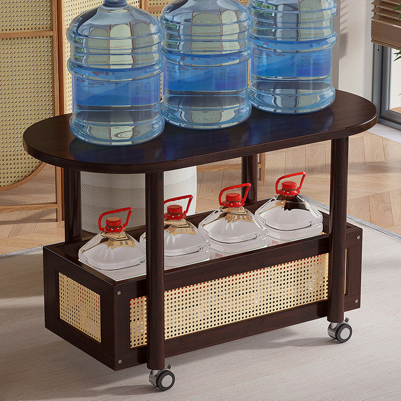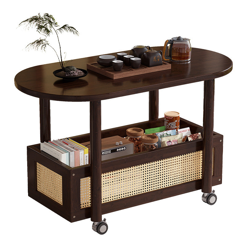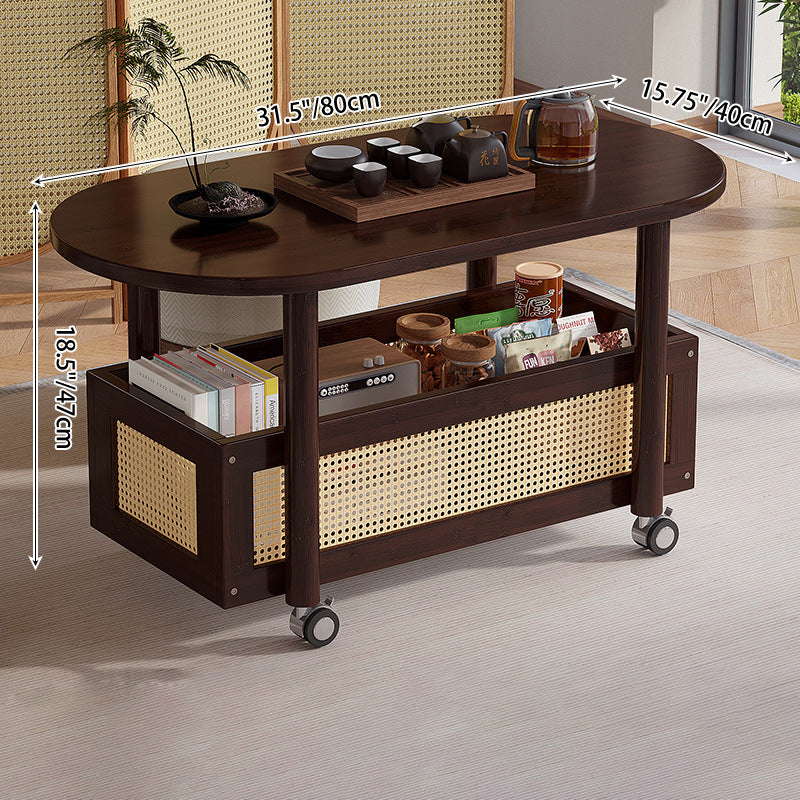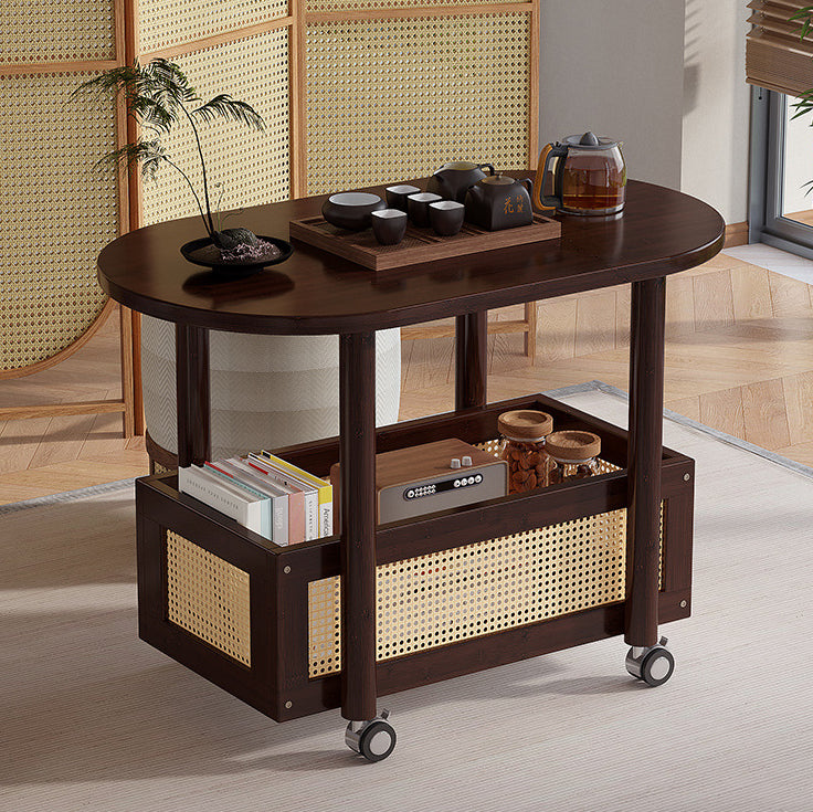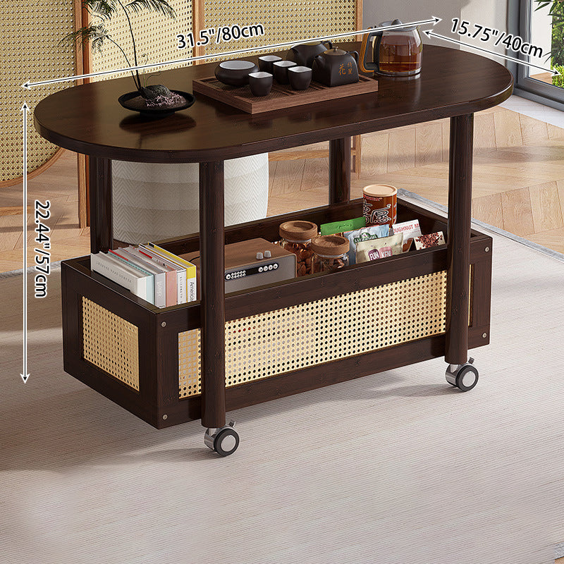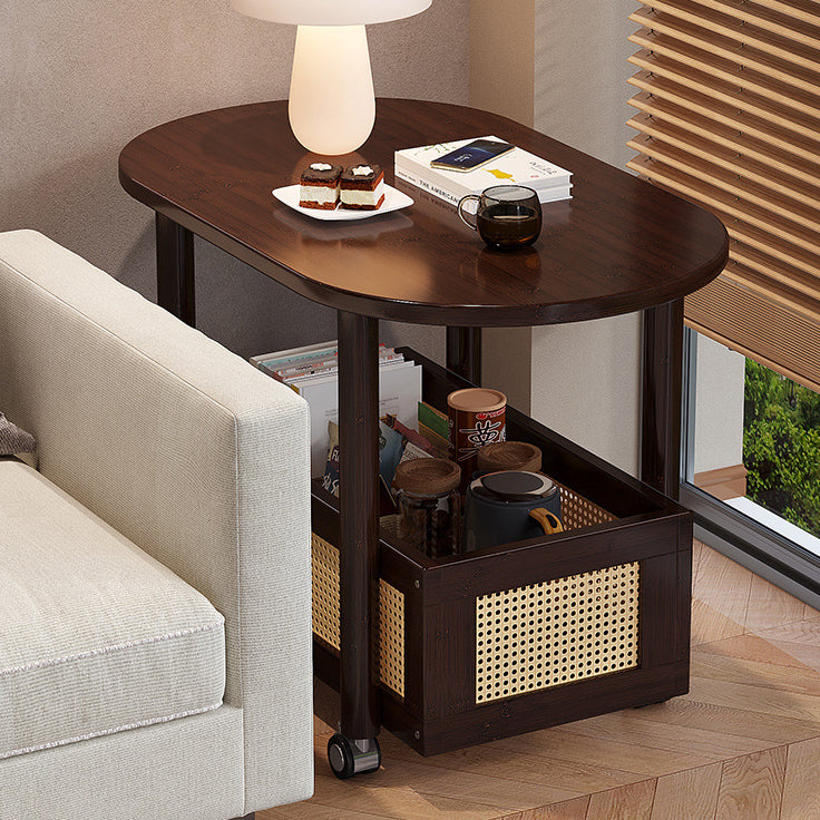 This Traditional Vintage side table combines natural bamboo and woven plastic rattan in a warm walnut finish, offering a classic yet practical touch to any living room. Designed with a storage basket and smooth-rolling caster wheels, it provides easy mobility and convenient space for books, snacks, or décor.