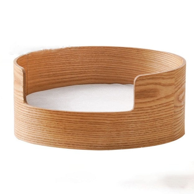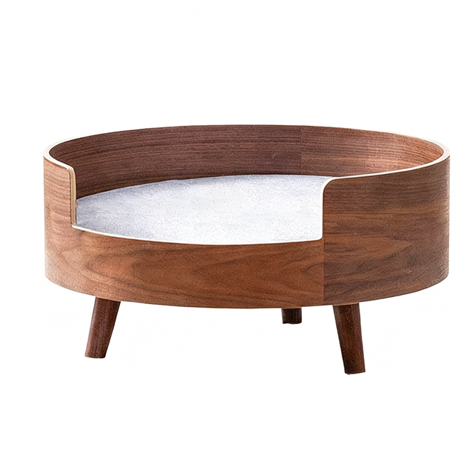 This versatile bed is designed to accommodate both cats and small dogs. It includes an optional removable cushion for an added layer of plush comfort. Available in sophisticated walnut and light ash wood finishes, you can choose between a version with or without legs to best suit your floor space and aesthetic. This piece is optimized for North American consumers searching for solid wood cat beds, round pet furniture, designer cat scratchers, and walnut or ash wood pet accessories for contemporary living rooms and bedrooms.