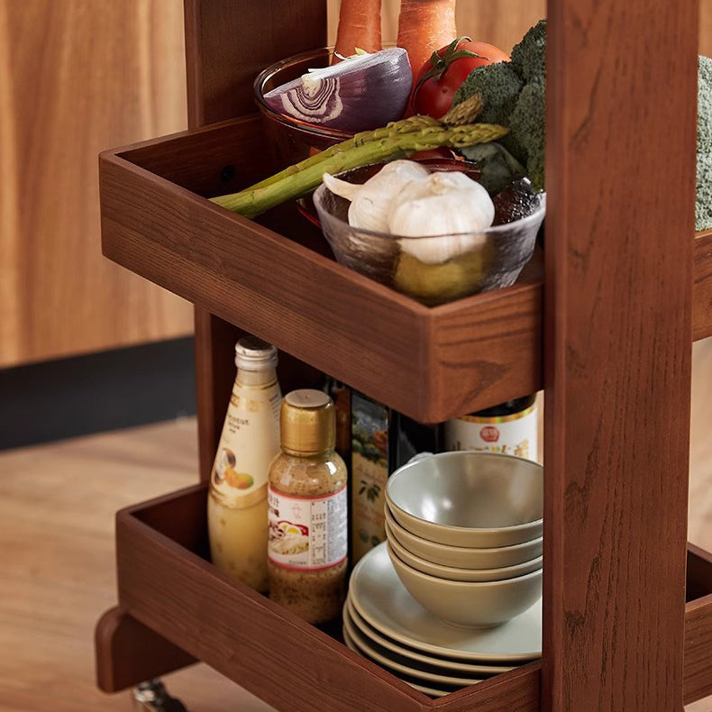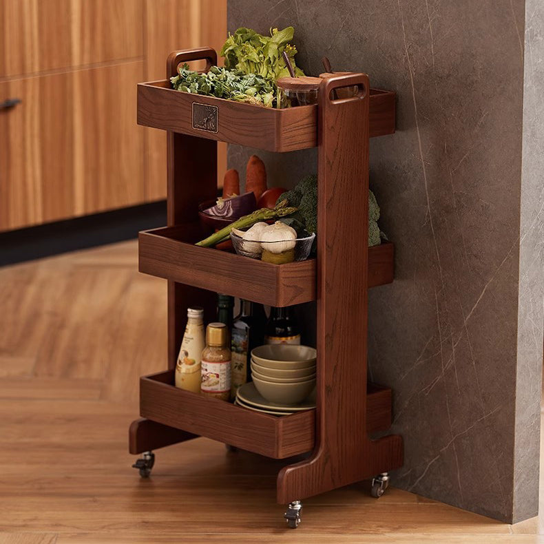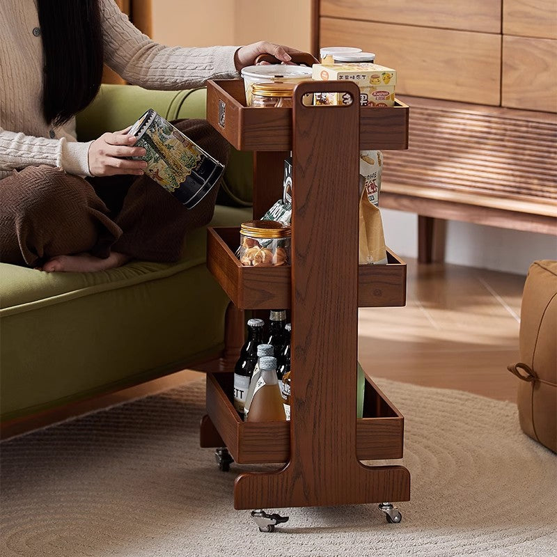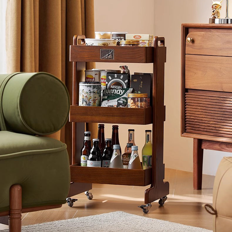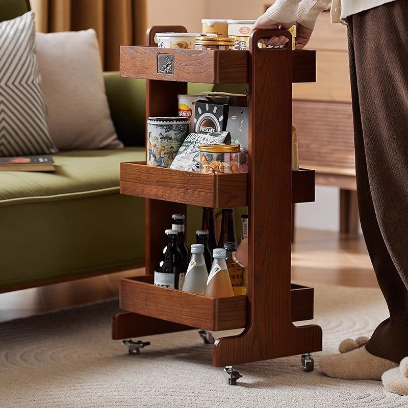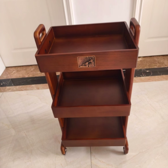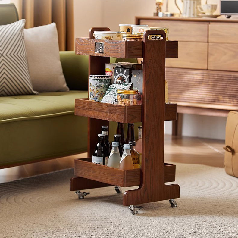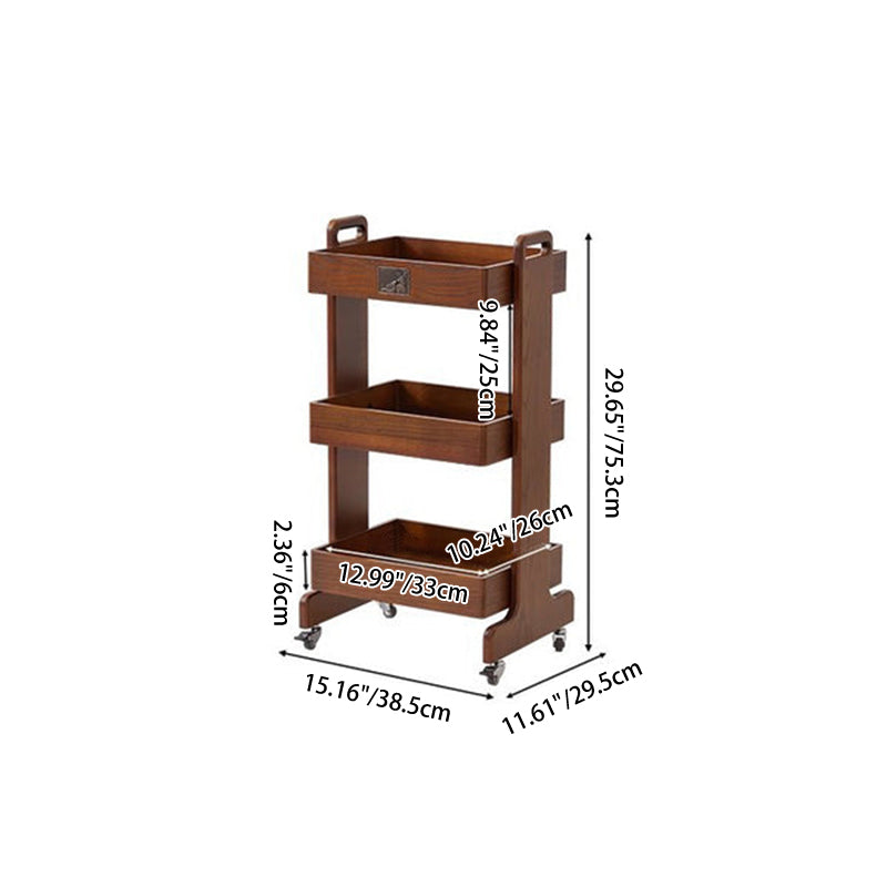Cette table d'appoint mobile en bois massif vintage traditionnel présente un design carré avec un rangement à 3 niveaux, offrant une forte capacité de charge et un déplacement facile avec des roulettes pivotantes. Fini en noyer riche, il est parfait pour l'organisation du salon, l'heure du thé ou le stockage polyvalent de la maison.