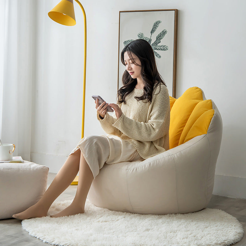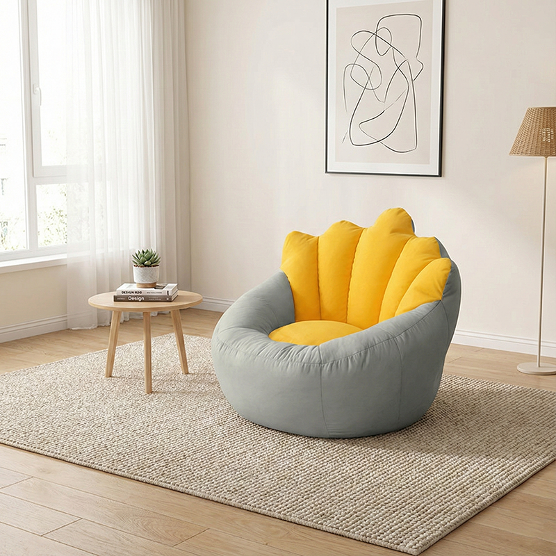 This contemporary EPS bead-filled crown lounge chair features a soft plush finish with a supportive backrest, offering cozy comfort for living rooms and bedrooms. Available in beige, yellow, and gray, it’s a playful yet functional seating option perfect for relaxing, reading, or adding a stylish touch to any space.