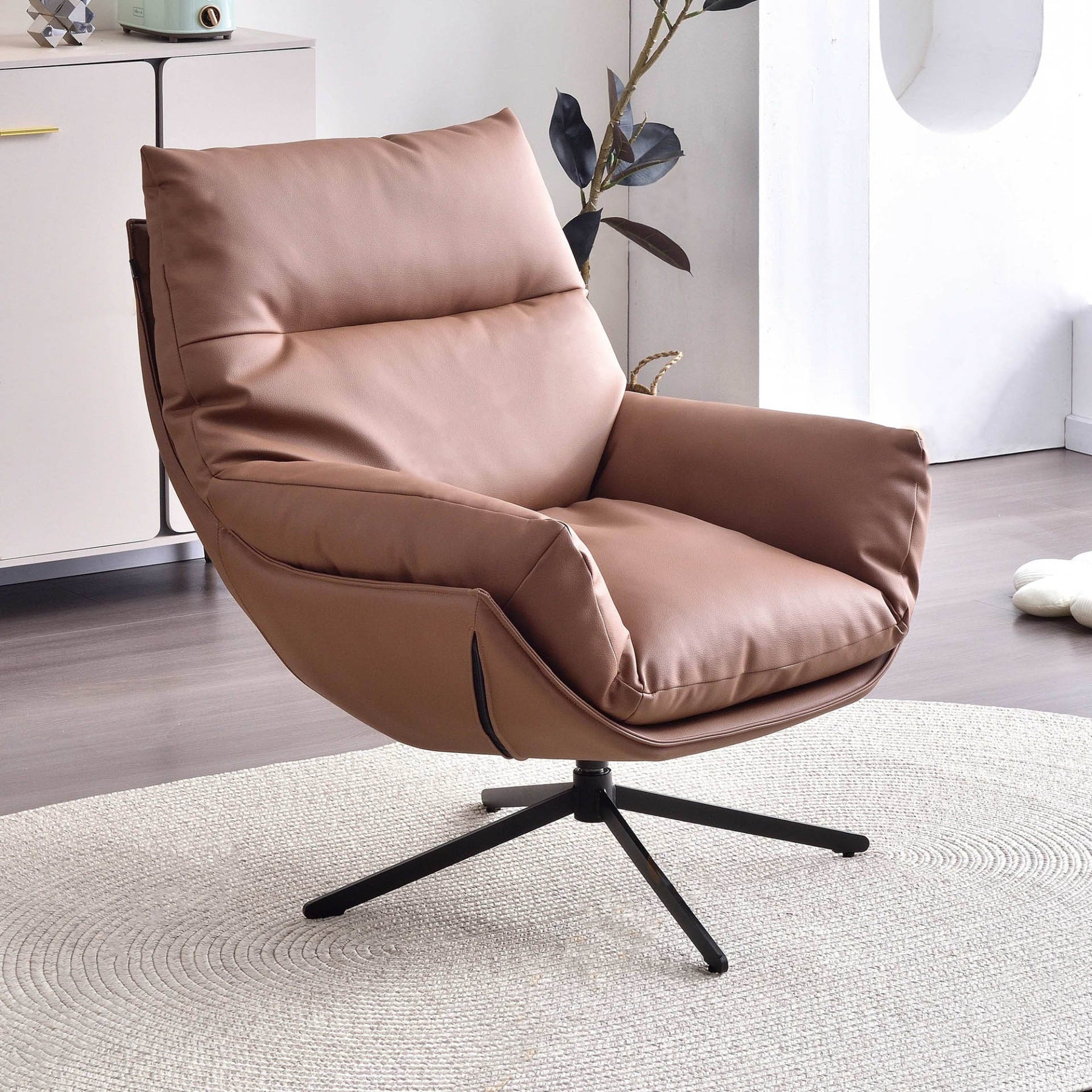 This modern minimalist sofa chair, with a sleek silhouette and exquisite craftsmanship, epitomizes modern design’s inherent simplicity and comfort. It offers one fabric options: eco-friendly faux leather---smooth to the touch, abrasion-resistant for durability, and easy to clean for daily care. Stuffed with AA doll cotton and sponge, its backrest and armrests are plush, resilient, and supportive, delivering a cloud-like seating experience. Ideal for living rooms, studies, or offices, it adds stylish flair to spaces and seamlessly fits home/office settings, guaranteeing cozy seating moments.