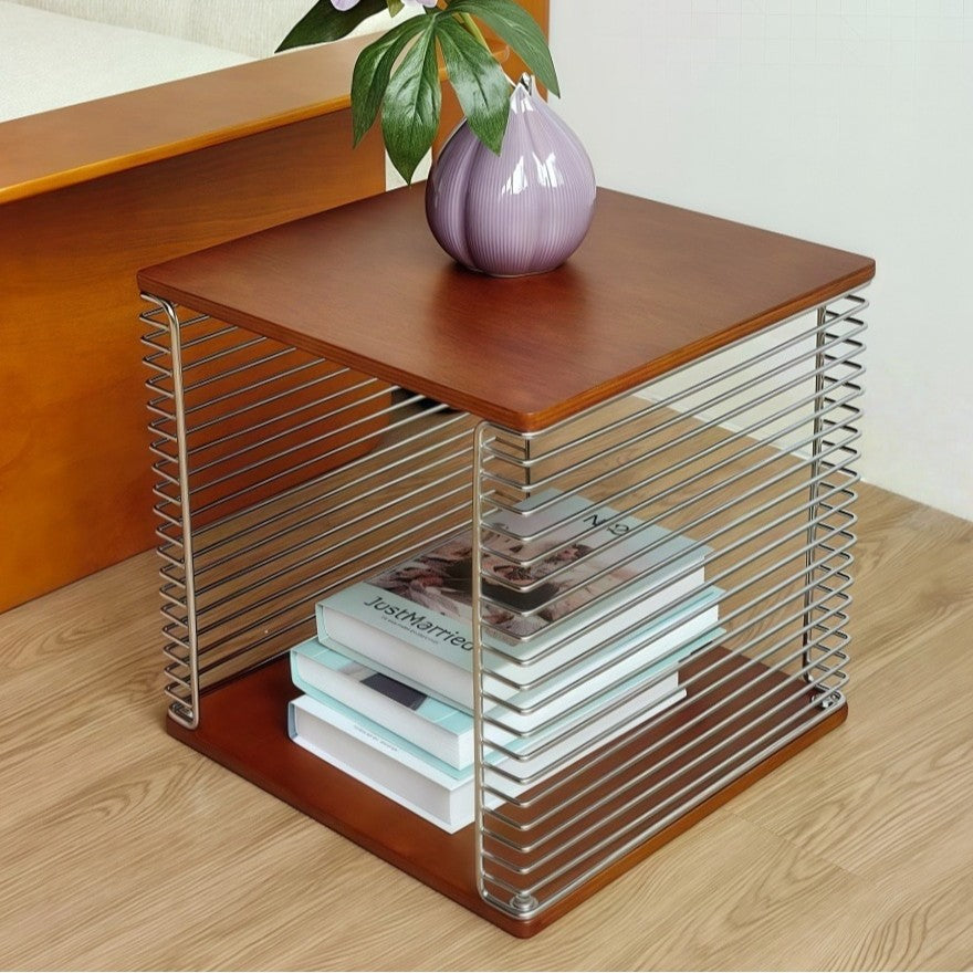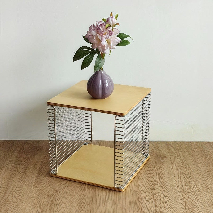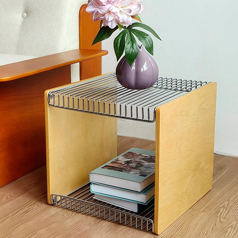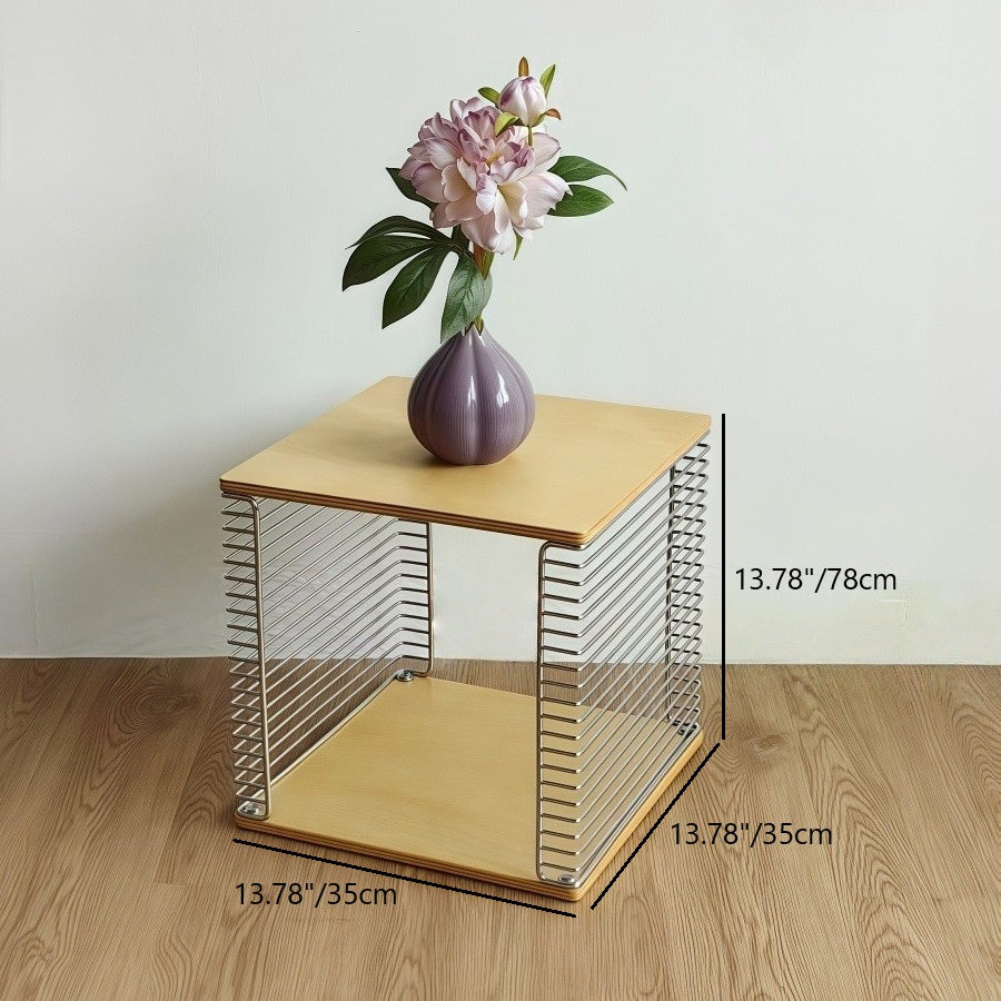 Contemporary Scandinavian Solid Wood Plywood Stainless Steel Square Hollow End Table 2-Tier For Living Room