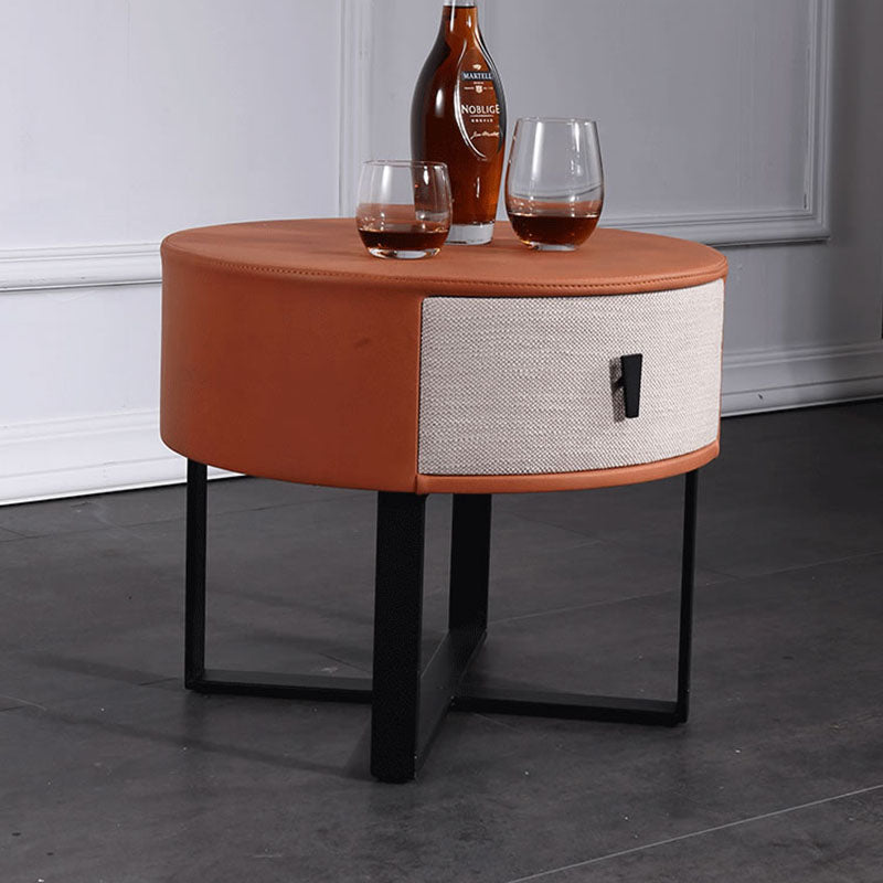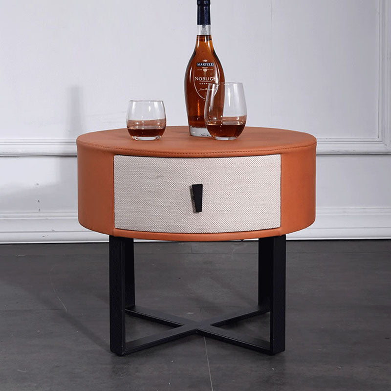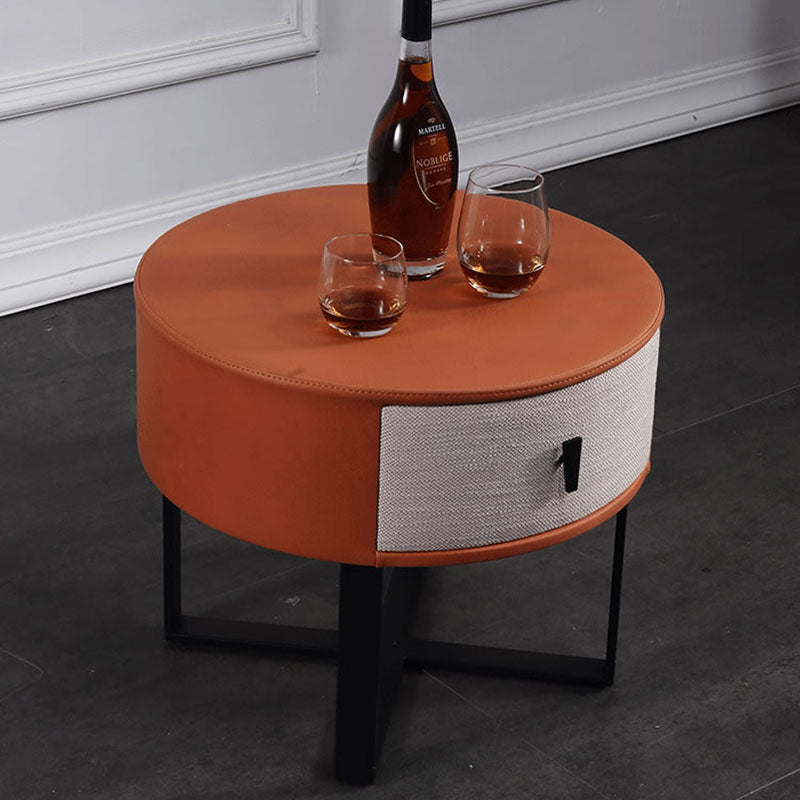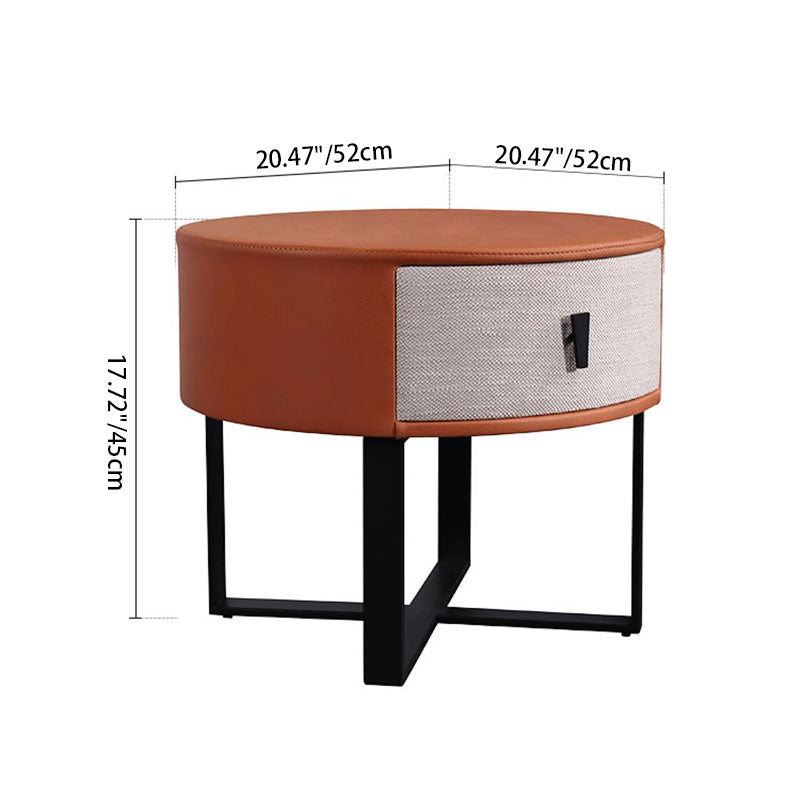 Contemporary Creative Round Circular 1 Drawer Nightstand - Faux Leather Metal Legs Bedside Table For Bedroom