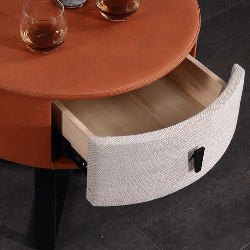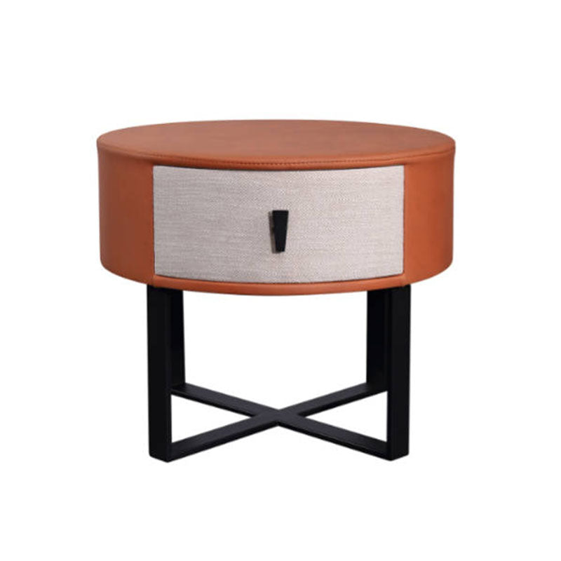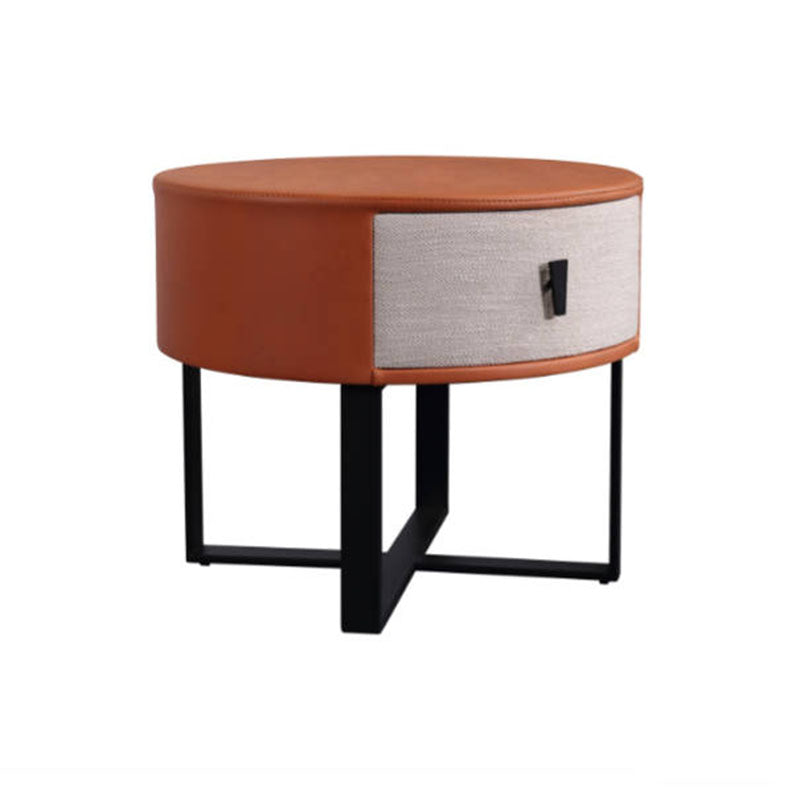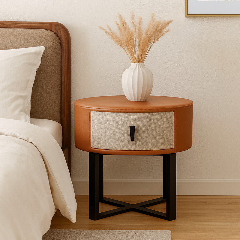 Bring sculptural elegance into your bedroom with this contemporary round nightstand. Wrapped in premium faux leather, its smooth curves and soft form add warmth and sophistication to your space. The textured veneer drawer introduces natural contrast, while the sleek metal frame elevates the design with modern industrial balance. Functional and eye-catching, this nightstand blends fashion and utility, transforming any bedroom into a stylish retreat.