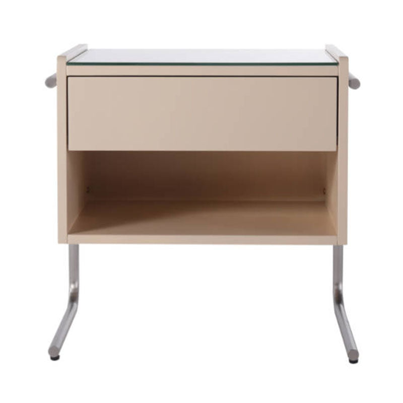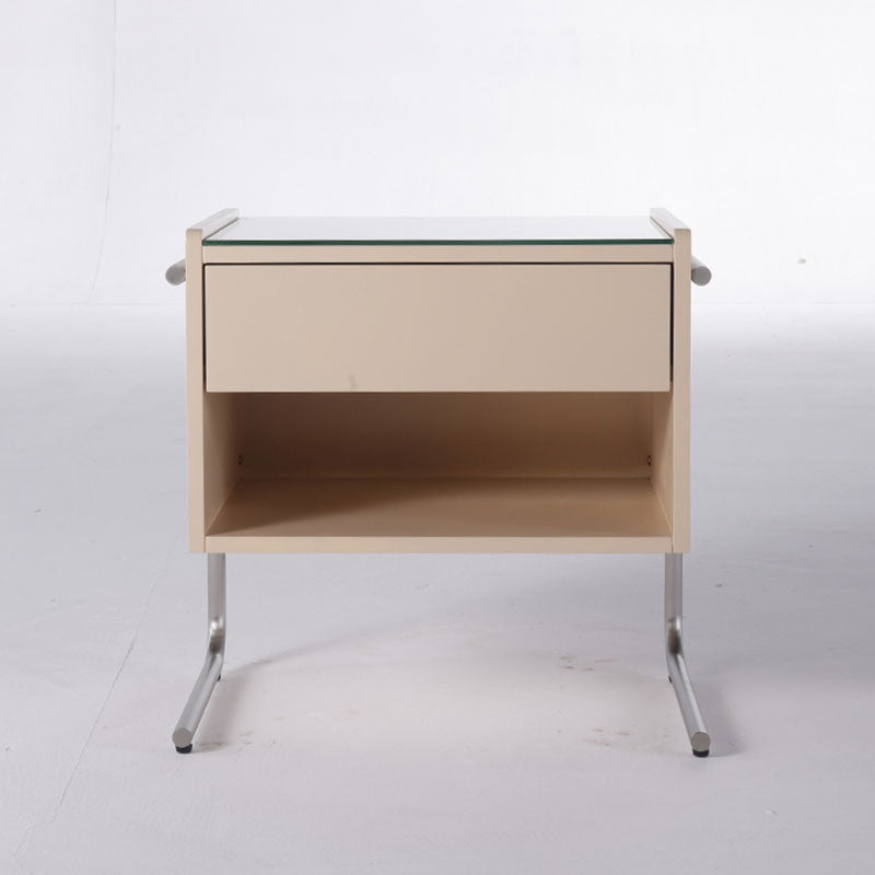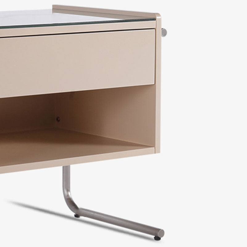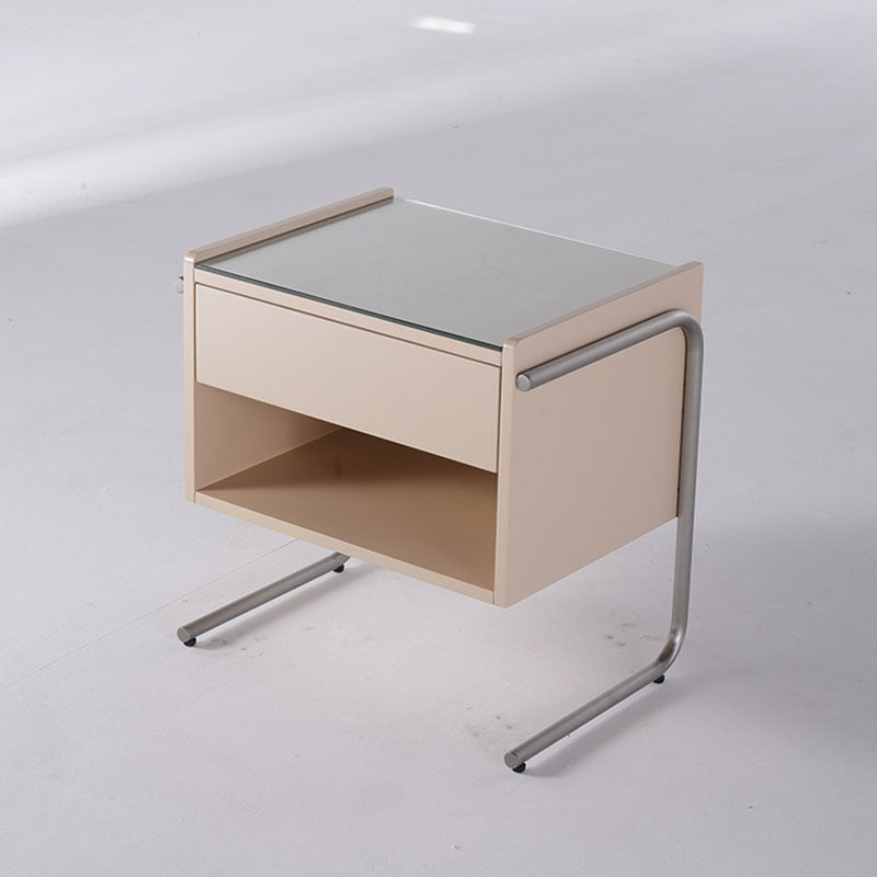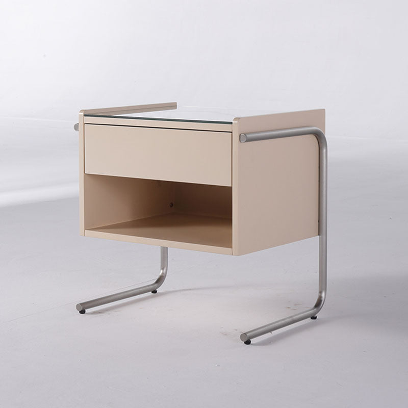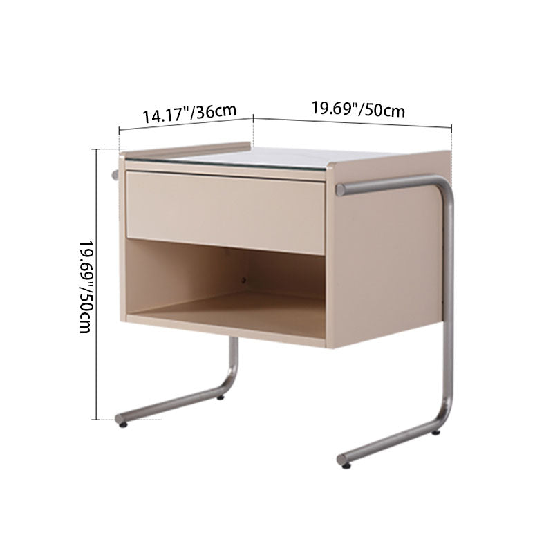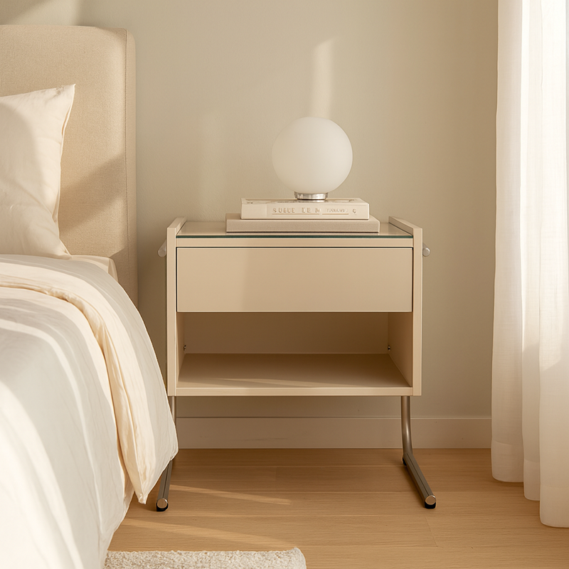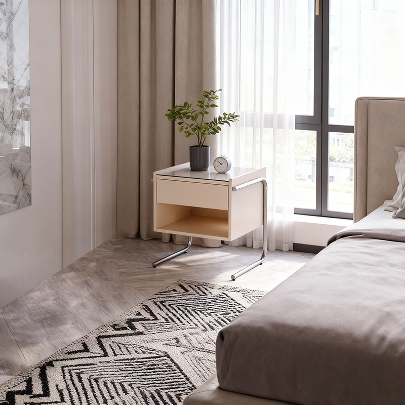 This contemporary bedside table combines modern industrial aesthetics with creative functional design. Built from eco-friendly MDF board and supported by a stainless steel tubular frame, it offers both stability and visual lightness. The tempered glass tabletop adds a refined glossy finish that enhances brightness while being scratch-resistant and easy to clean. Featuring a spacious drawer and open lower shelf, it provides practical bedside storage for books, decor, or essentials.