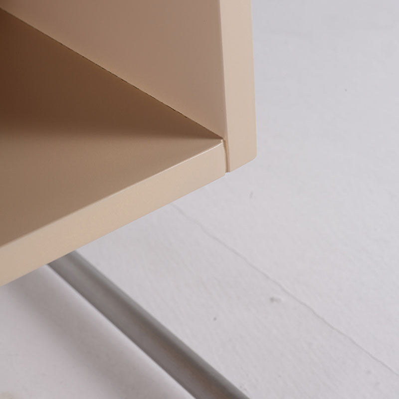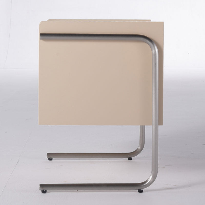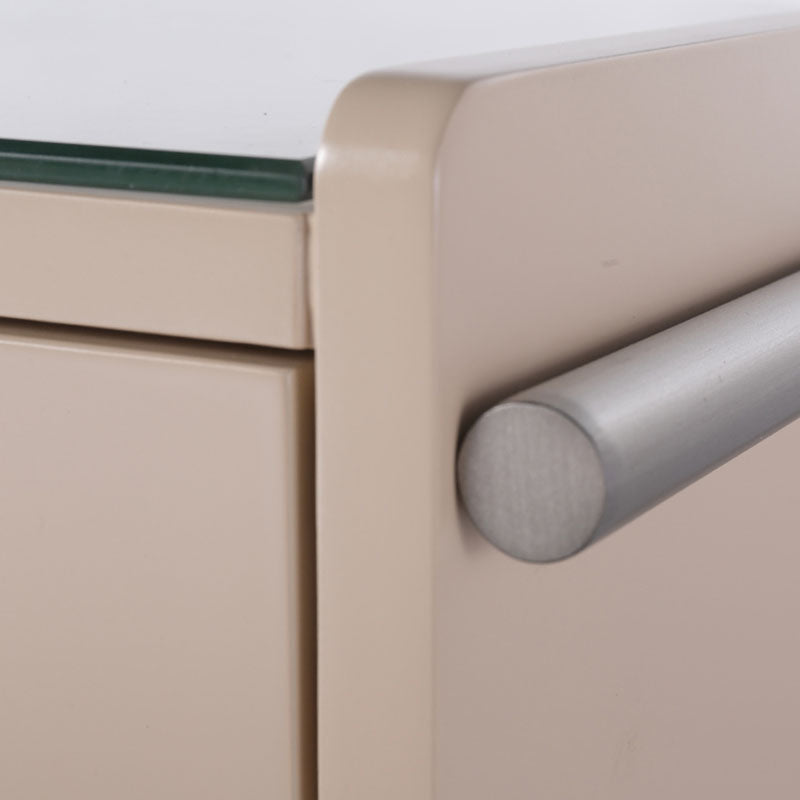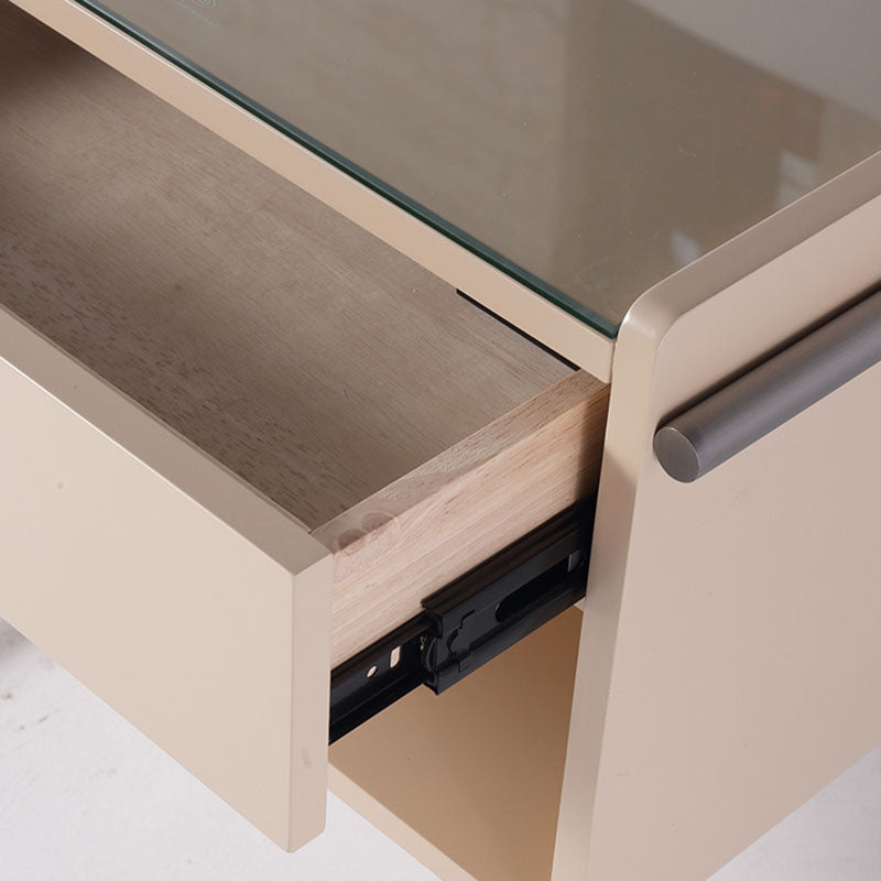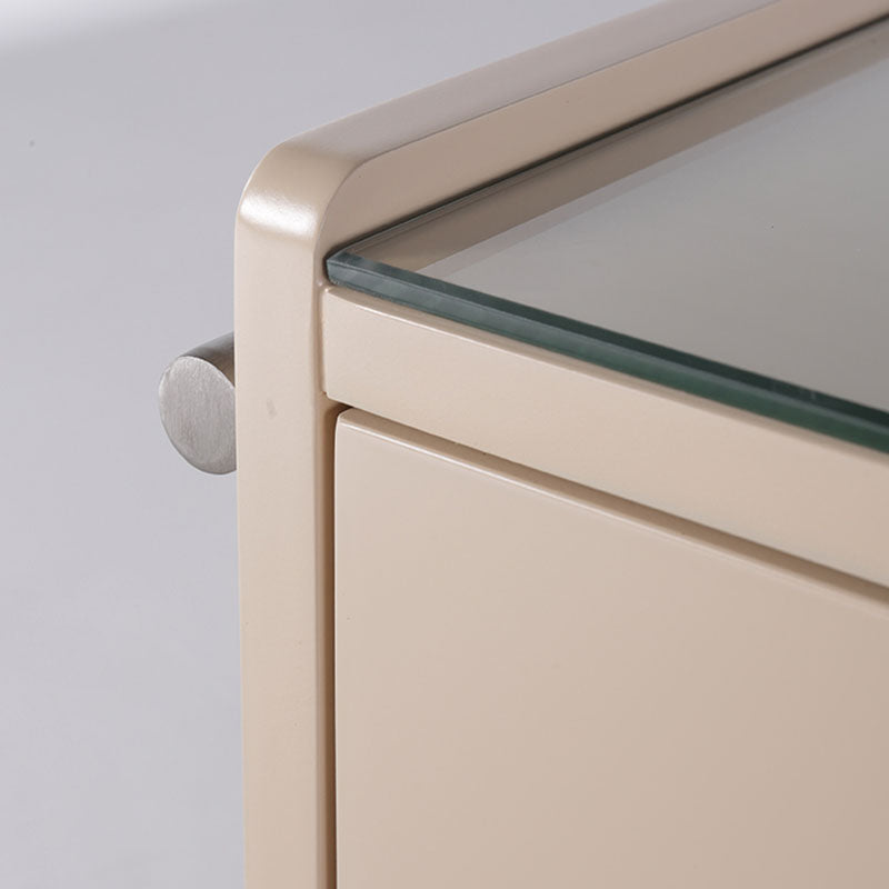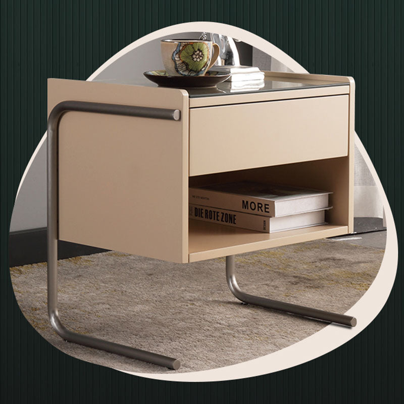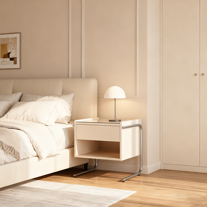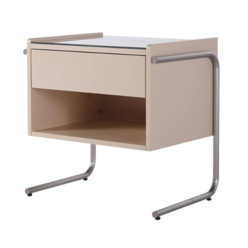 This contemporary bedside table combines modern industrial aesthetics with creative functional design. Built from eco-friendly MDF board and supported by a stainless steel tubular frame, it offers both stability and visual lightness. The tempered glass tabletop adds a refined glossy finish that enhances brightness while being scratch-resistant and easy to clean. Featuring a spacious drawer and open lower shelf, it provides practical bedside storage for books, decor, or essentials.