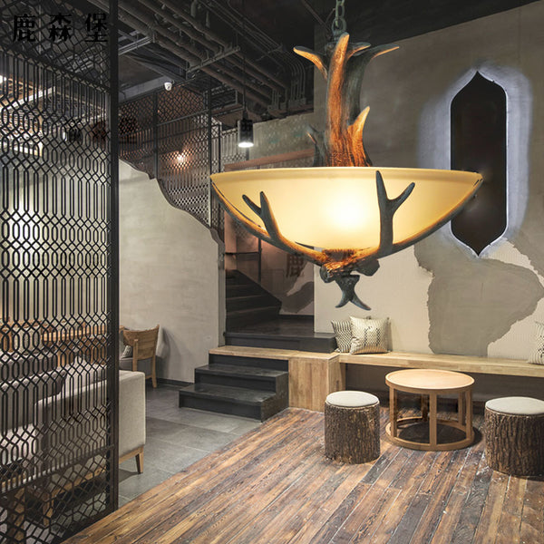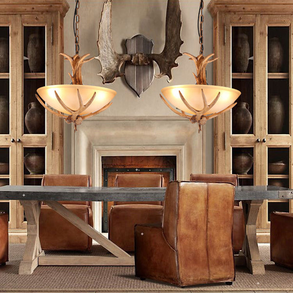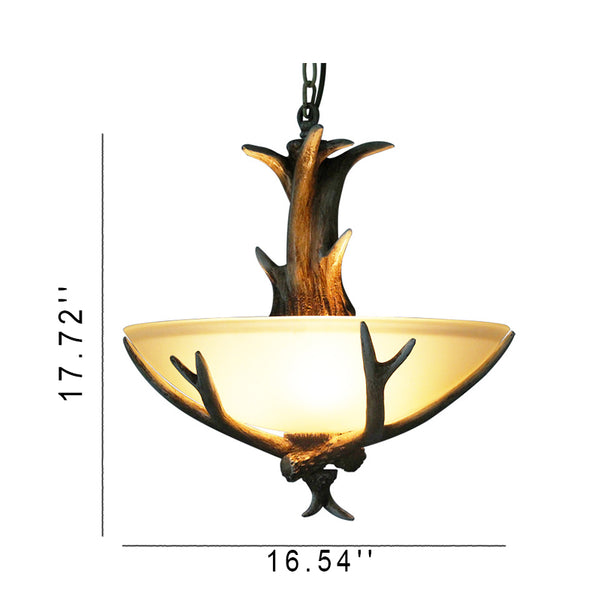 ヴィンテージ樹脂の枝角ガラスボウル3灯シャンデリア