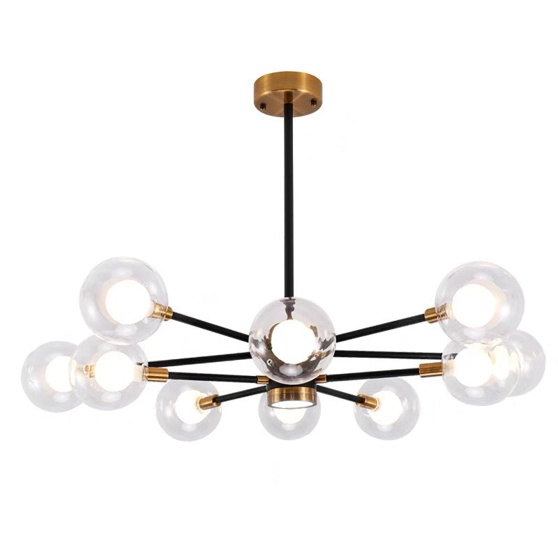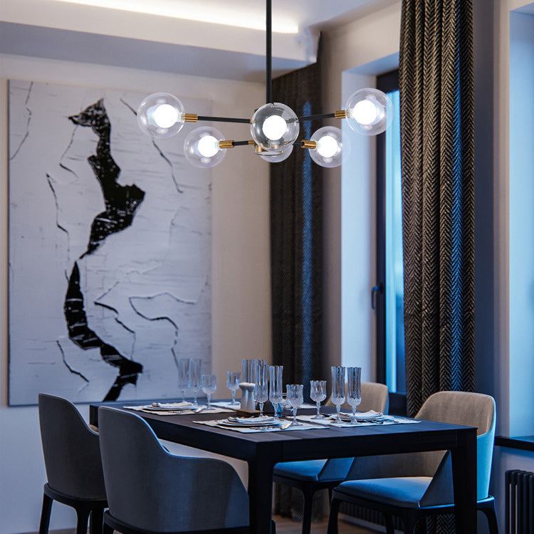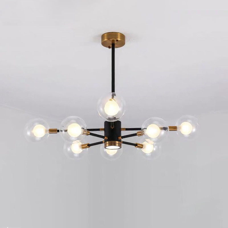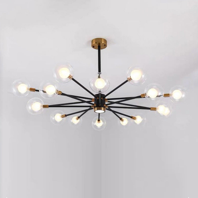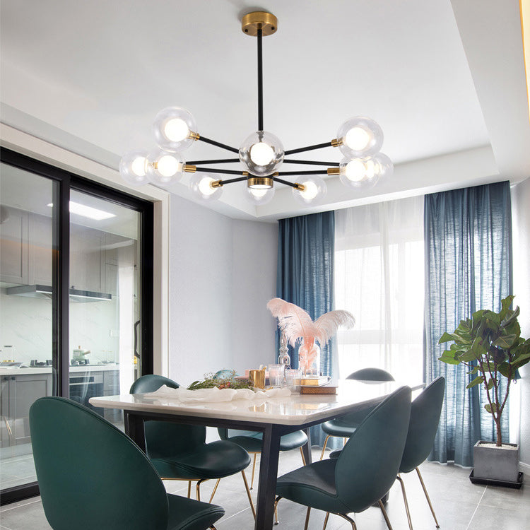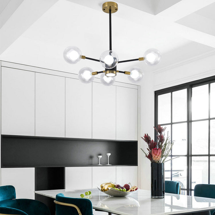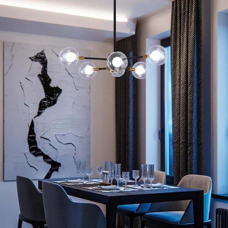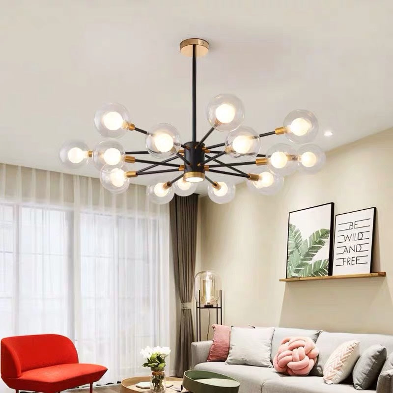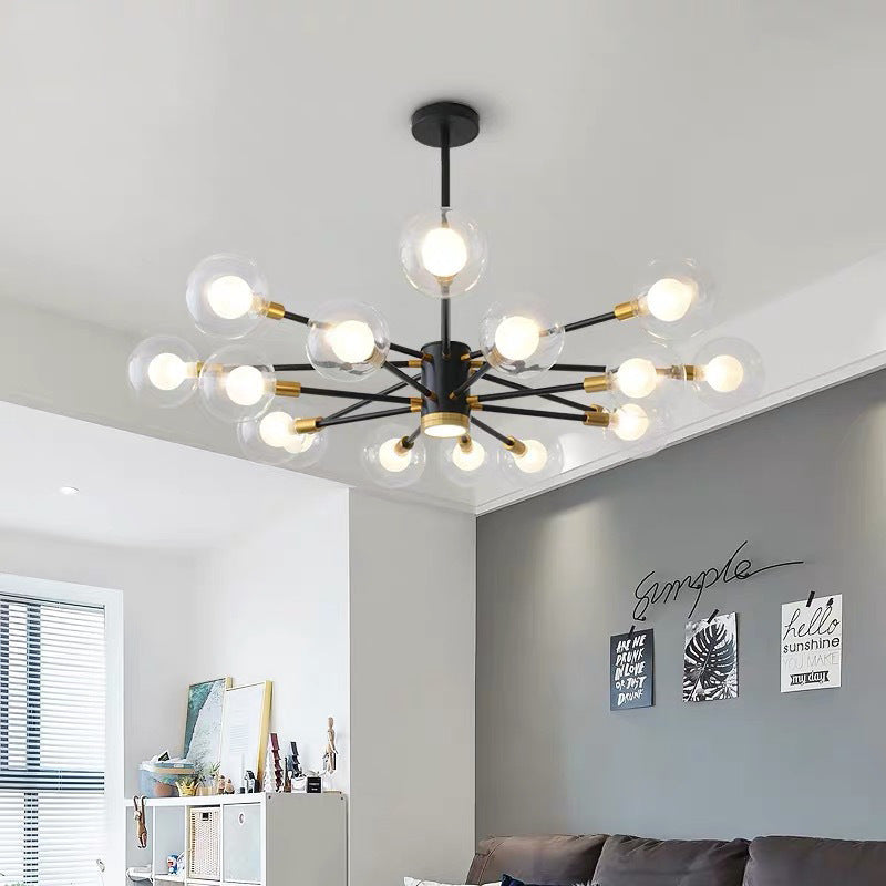 このモダンなシャンデリアは、ガラスと鉄で作られたユニークな枝と球体のデザインを特徴としており、ブラックまたはゴールドの仕上げが選べます。6、8、12、または16個の柔らかな光を放つライトで、優しい非眩光の照明を提供し、現代的なリビングルームやオープンなダイニングスペースに最適です。