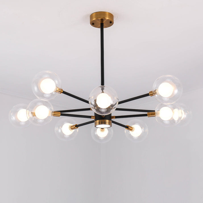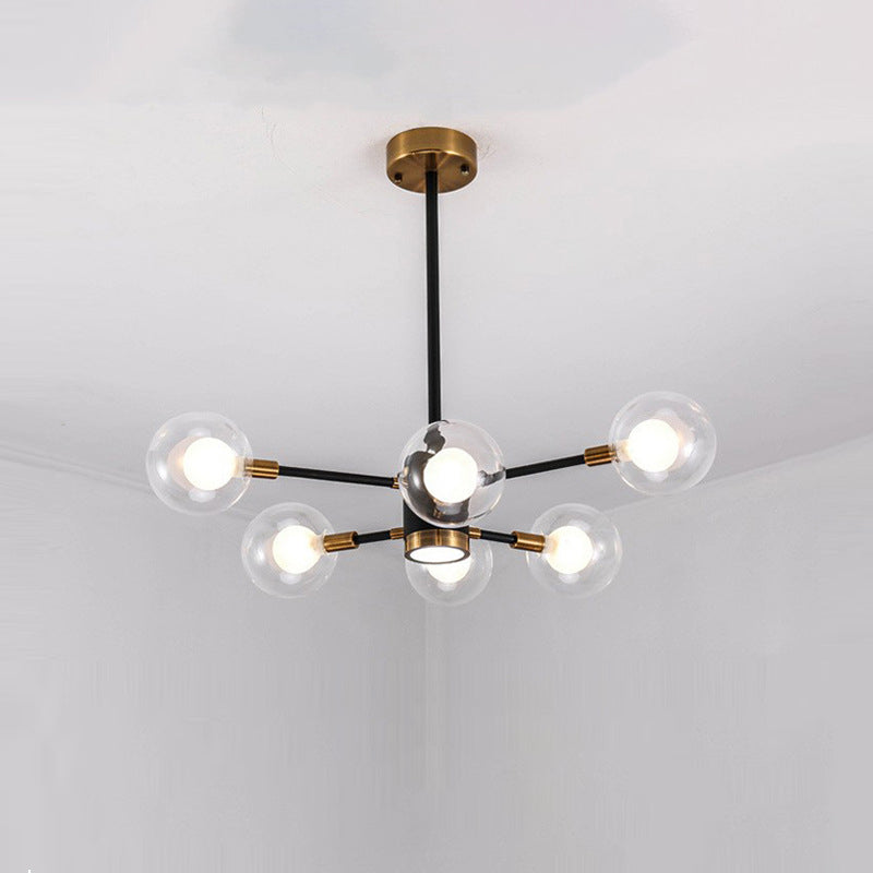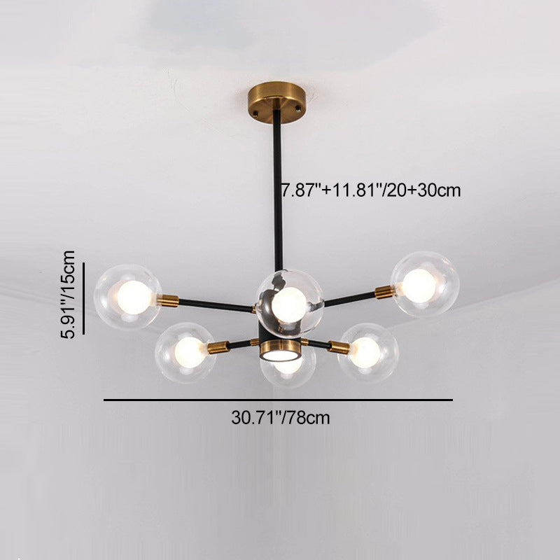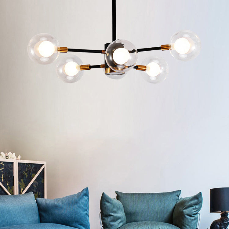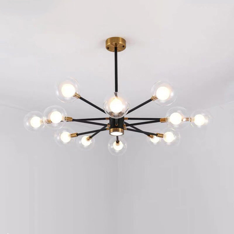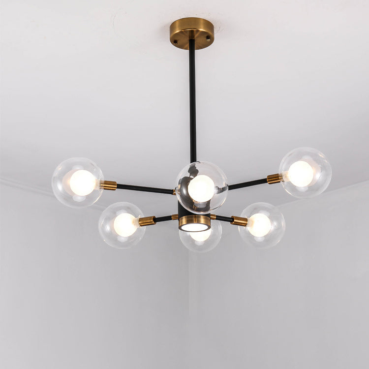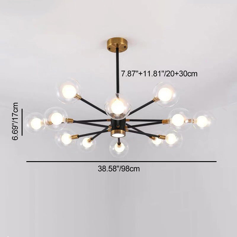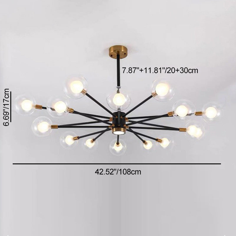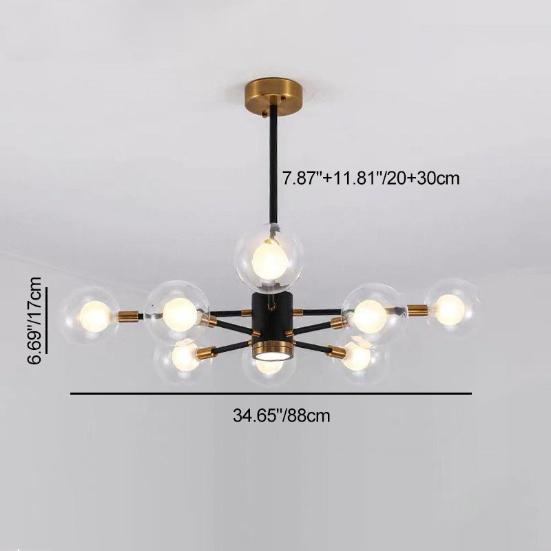 このモダンなシャンデリアは、ガラスと鉄で作られたユニークな枝と球体のデザインを特徴としており、ブラックまたはゴールドの仕上げが選べます。6、8、12、または16個の柔らかな光を放つライトで、優しい非眩光の照明を提供し、現代的なリビングルームやオープンなダイニングスペースに最適です。
