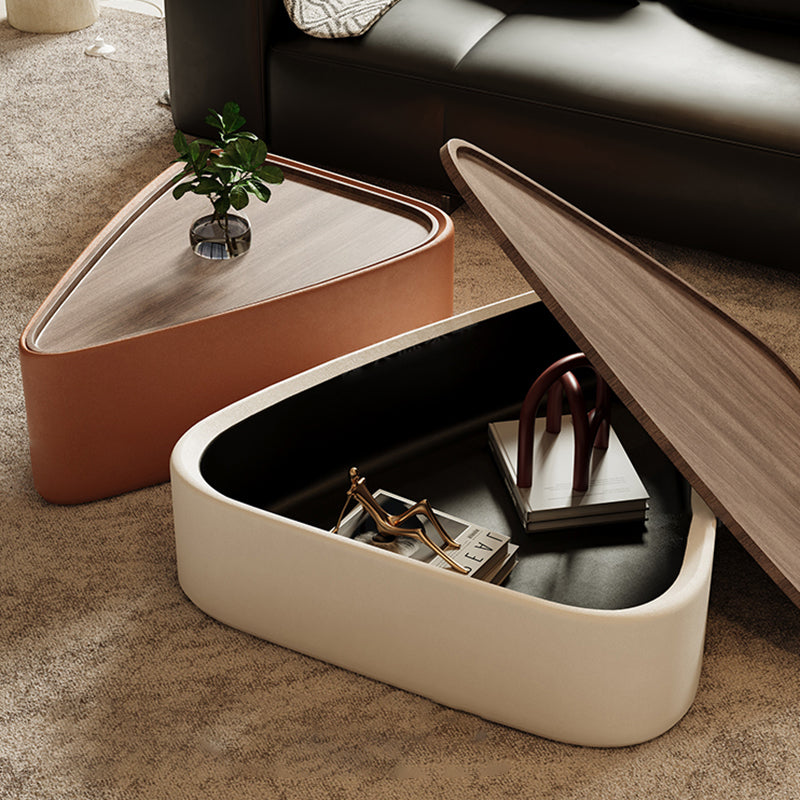 Embodying a minimalist designer aesthetic with crucial functionality, this table features rounded edges for safety and style, and a cleverly hidden cabinet offering large-capacity storage for media, blankets, or magazines. Its unique shape and refined proportions make it a space-saving centerpiece, perfect for anchoring contemporary living rooms and entertaining areas. Available in four high-end tones: vibrant Orange, deep Brown, neutral Cream White, and classic Black, this piece is optimized for North American consumers searching for luxury leather coffee tables, triangular designer furniture, Nappa leather wrapped centerpieces, and modern minimalist storage tables.