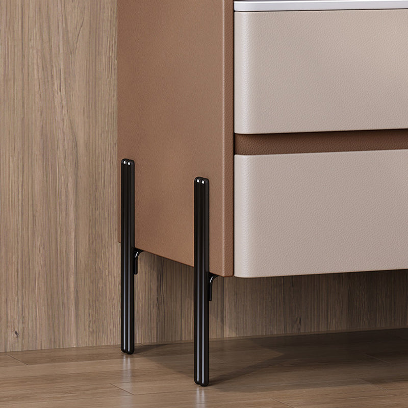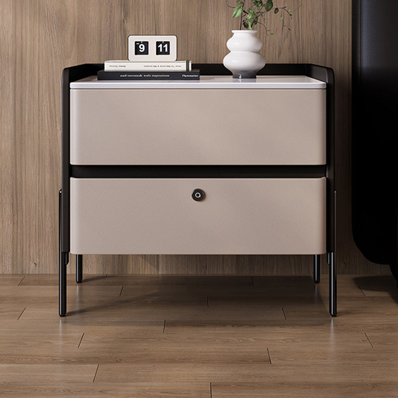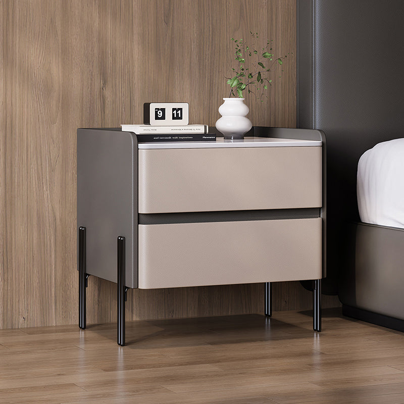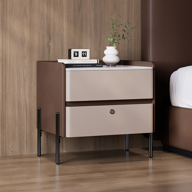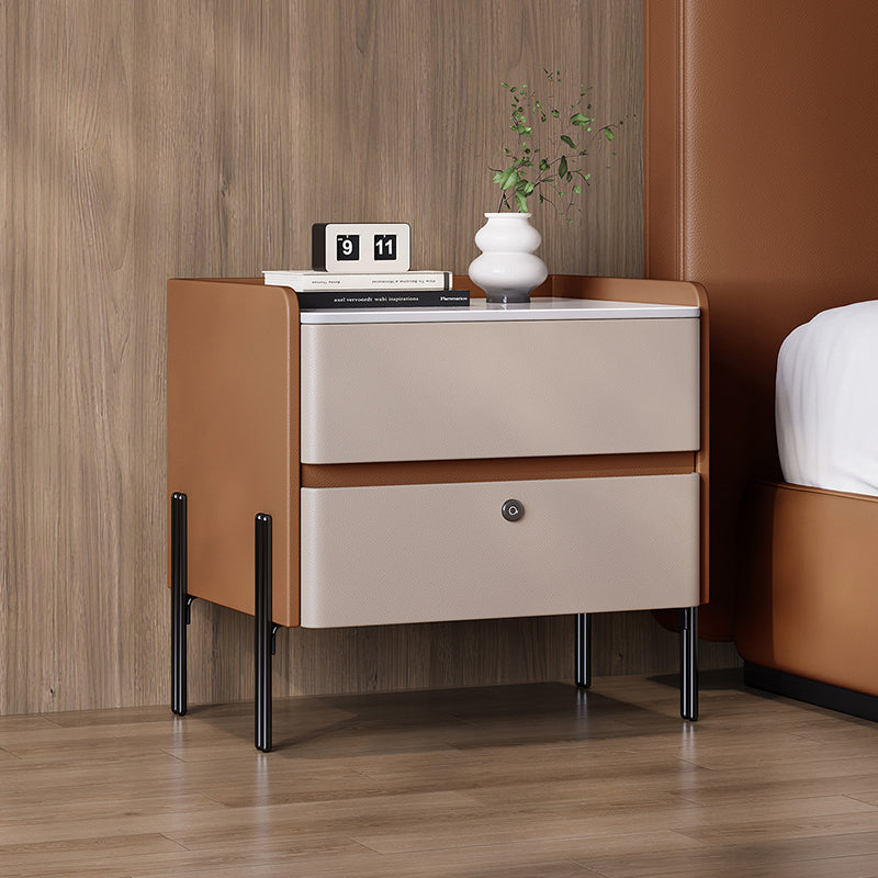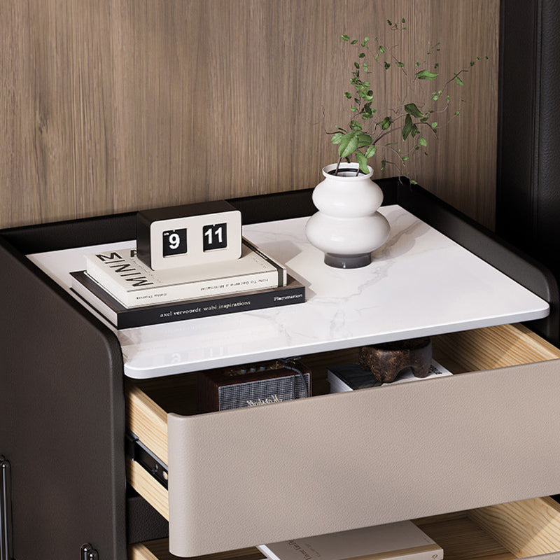 Elevate your sanctuary with this modern minimalist nightstand, where form meets essential function. Crafted from solid pine and crowned with a resilient sintered stone top, this piece offers a refined aesthetic without compromising on durability. The dual-drawer design provides sophisticated organization, featuring a secure locking mechanism for your most valued essentials. With its heat-resistant surface, rounded safety edges, and strong load-bearing performance, it is a seamless addition to any contemporary interior. Choose from an understated palette of light brown, dark brown, light gray, dark gray, or orange to complement your unique style.