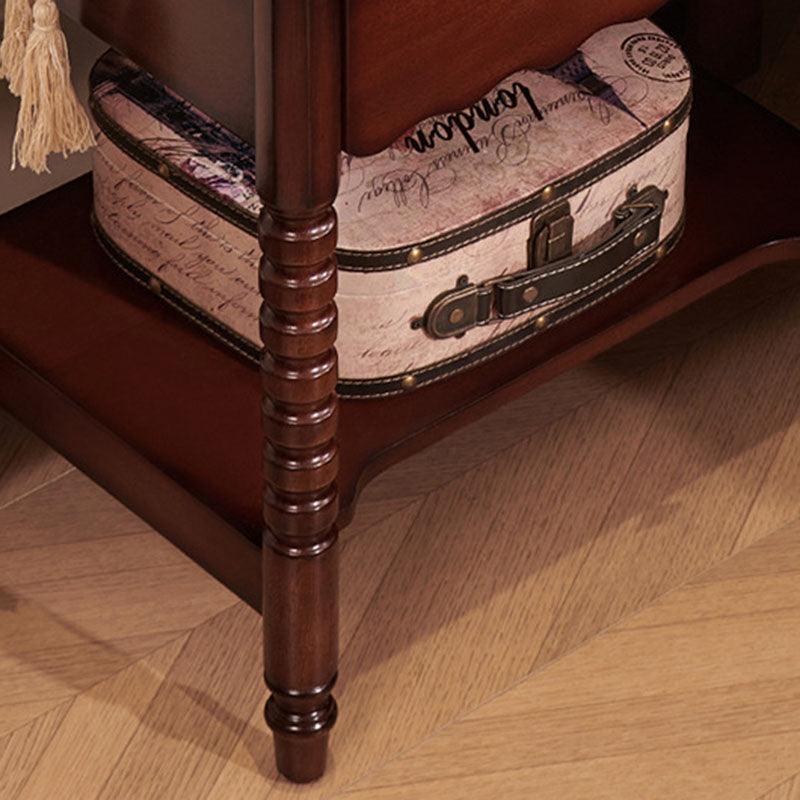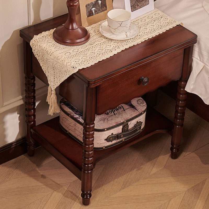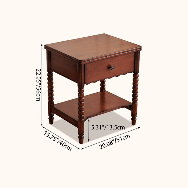 This traditional French–inspired nightstand features a solid wood structure with metal accents, showcasing a classic Roman column square silhouette for a refined vintage look. Designed with one functional drawer, smooth rounded edges, a raised open-base design for airy visual balance, and a metal pull handle, it is finished in cherry tones to bring elegant bedside storage to the bedroom.