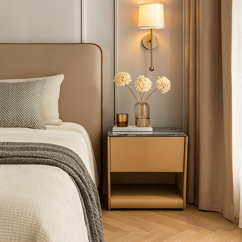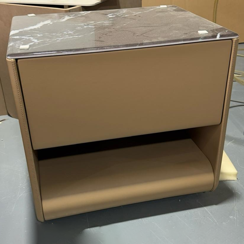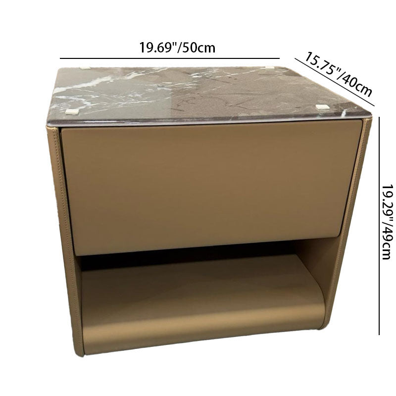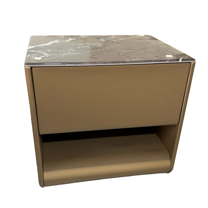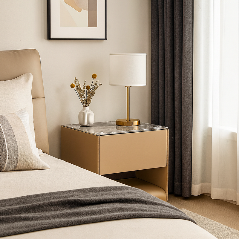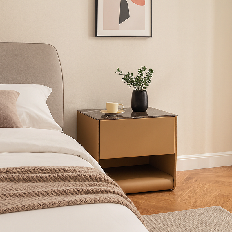 This modern luxury nightstand combines soft round contours with refined materials for a calm, elegant bedroom mood. Crafted from E1 eco-friendly board and wrapped in smooth faux-leather upholstery, it delivers a plush touch and premium detailing. The micro-crystal stone top features subtle marble veining and a satin sheen, offering elevated style with scratch-resistant durability. The push-open drawer keeps essentials neatly tucked away, while the curved open shelf adds sculptural lightness and extra storage.