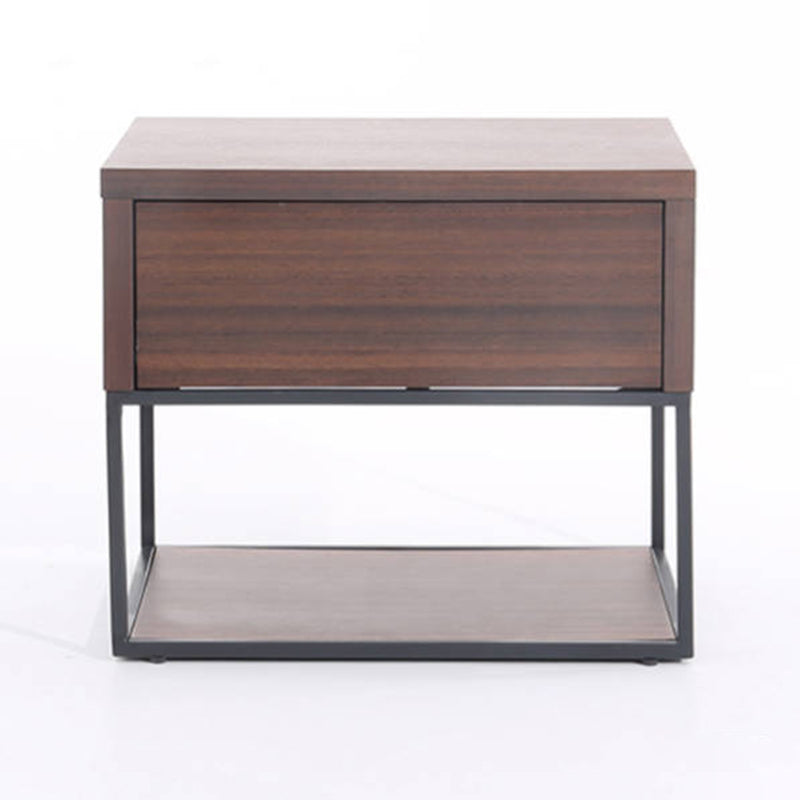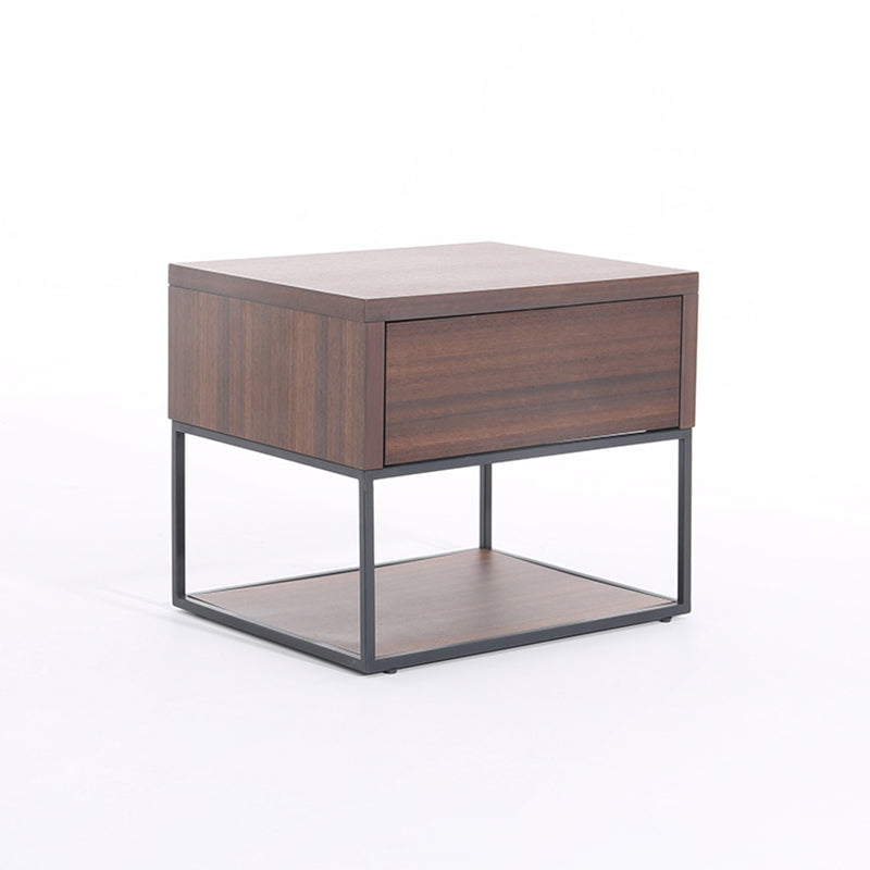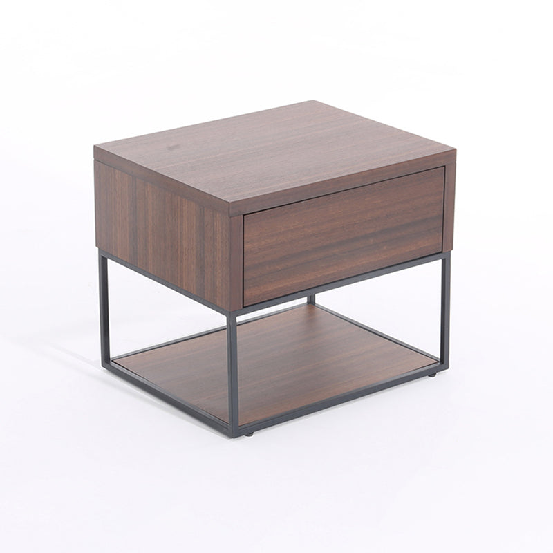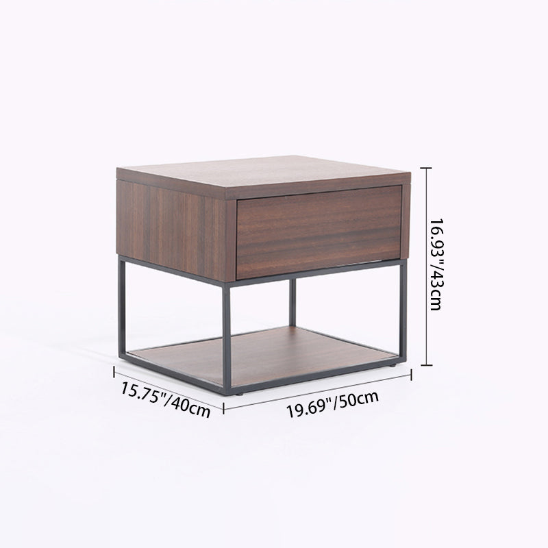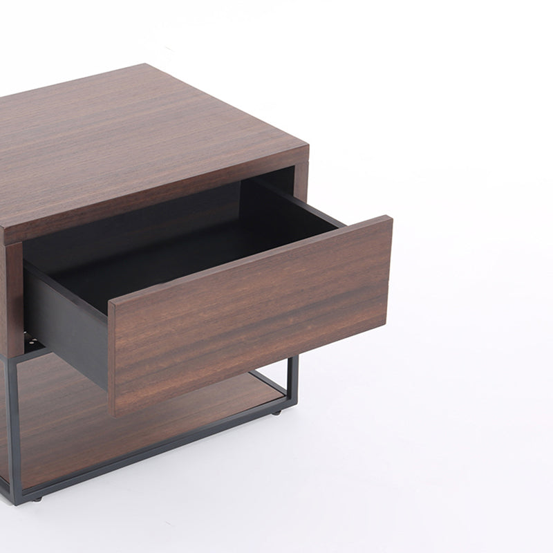 Bring quiet sophistication to your bedroom with this Modern Chinese-inspired Nightstand. Crafted with walnut-tone veneered plywood, eco-friendly MDF, and a steel frame, it features clean square lines, a grounded color palette, and an open lower shelf for added display and storage.