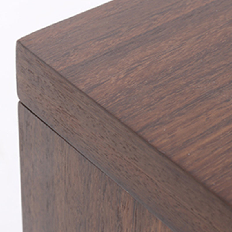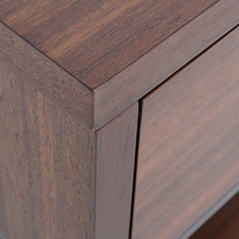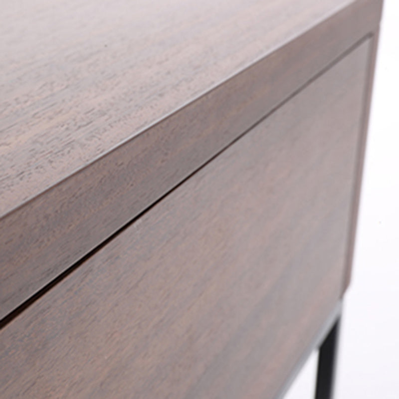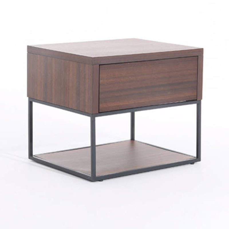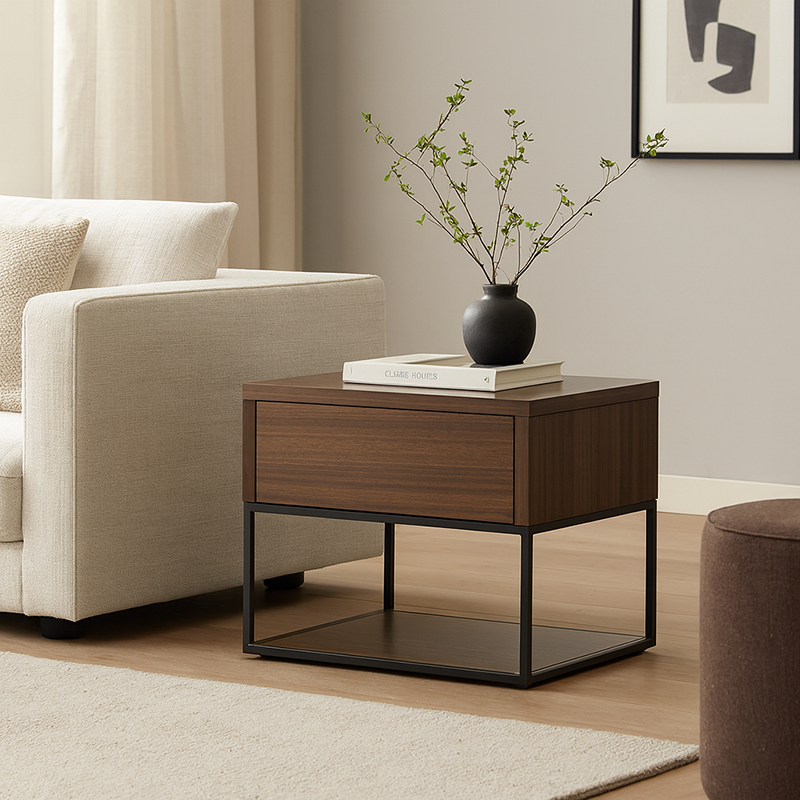Bring quiet sophistication to your bedroom with this Modern Chinese-inspired Nightstand. Crafted with walnut-tone veneered plywood, eco-friendly MDF, and a steel frame, it features clean square lines, a grounded color palette, and an open lower shelf for added display and storage.
