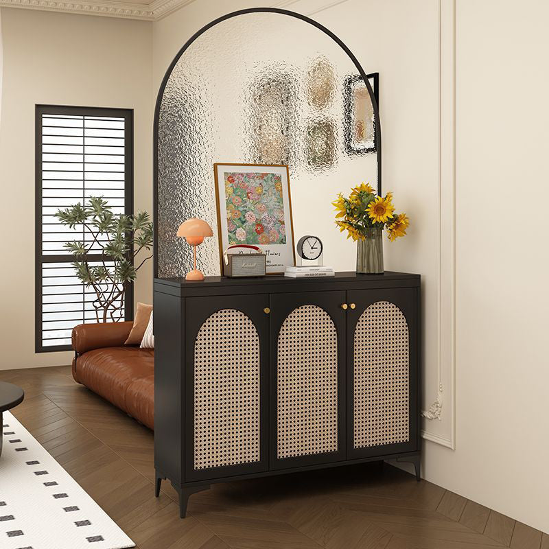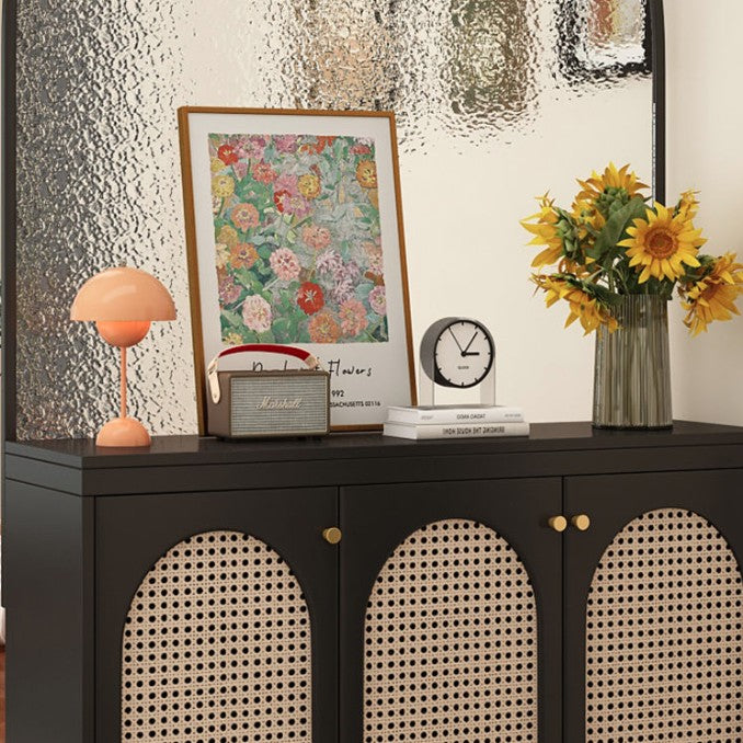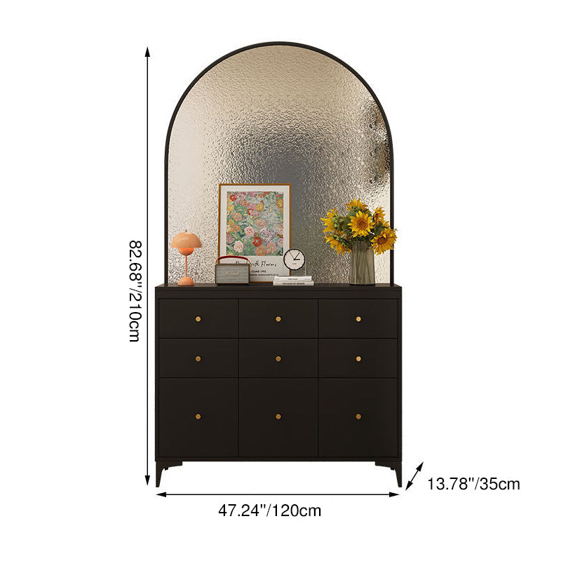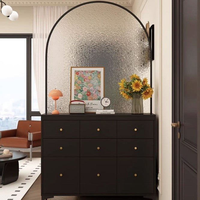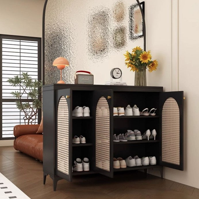 このエレガントなモダンミッドセンチュリーストレージキャビネットは、フェイクラタン、ソリッドウッドエコボード、ガラス、ステンレススチールを組み合わせた洗練された外観を持っています。6、9つの引き出し、または3層で設計されており、スタイリッシュな靴収納キャビネットや、玄関やリビングルームのための多用途オーガナイザーとしても機能します。半透明のガラススクリーンは光を通しながらプライバシーを保ち、頑丈なステンレススチールの脚が強力なサポートを提供します。広々としたトップ表面とゴールドサークルハンドルが、あなたの家の装飾に豪華さを加えます。