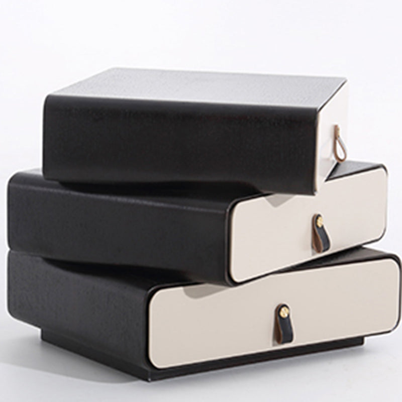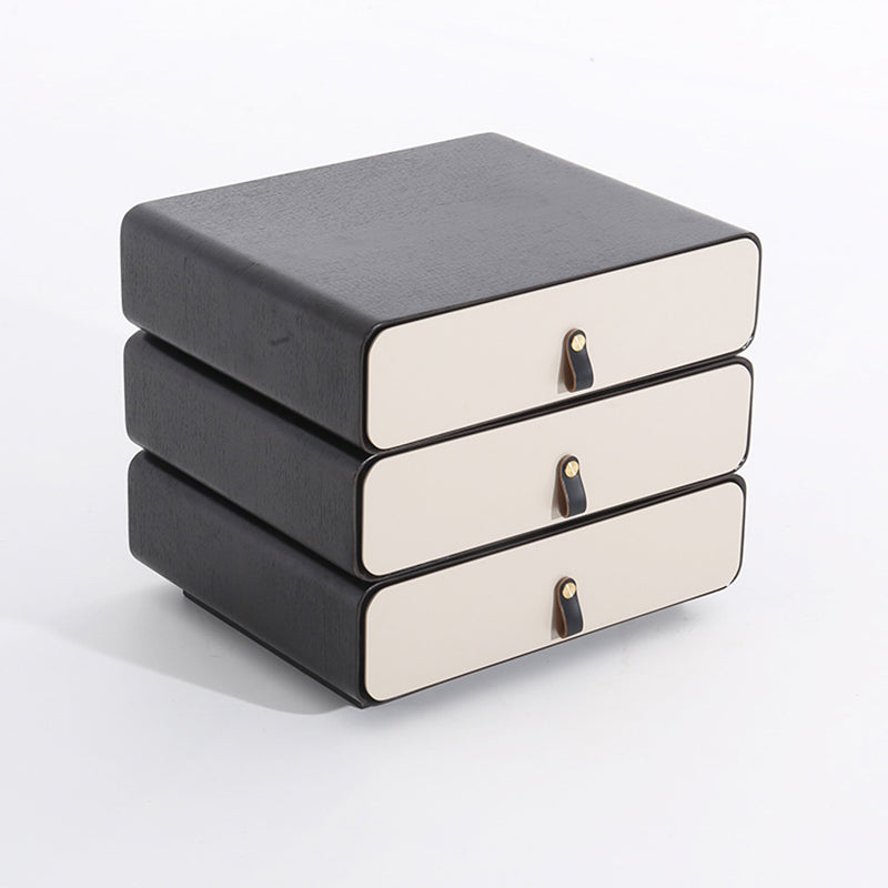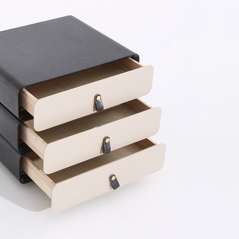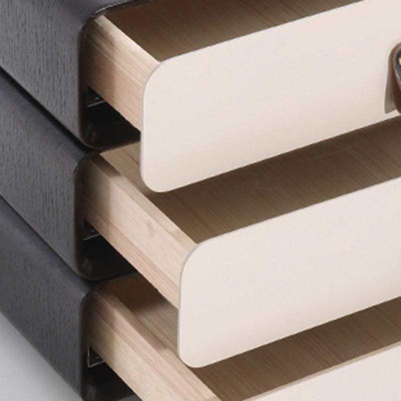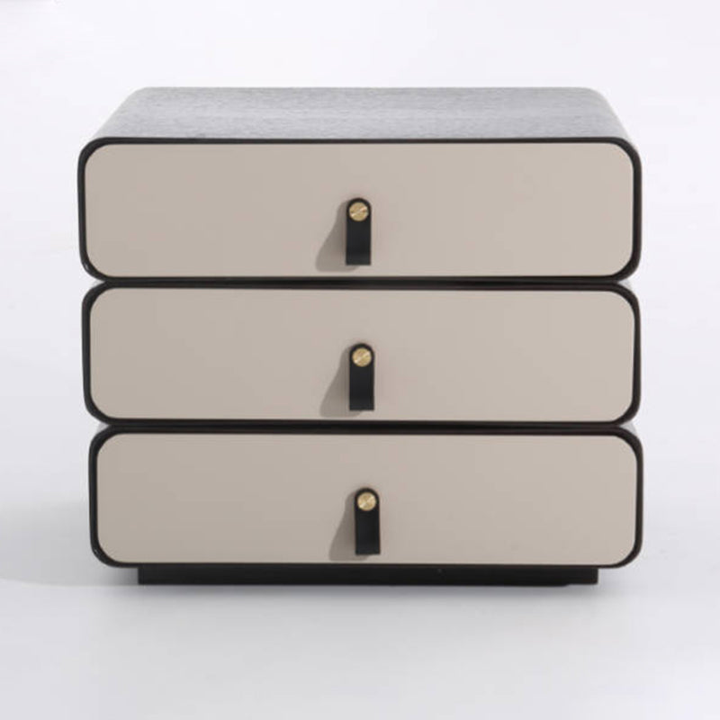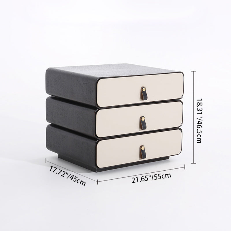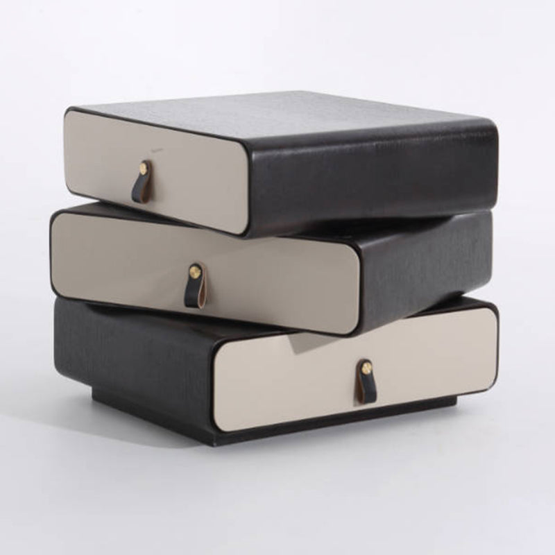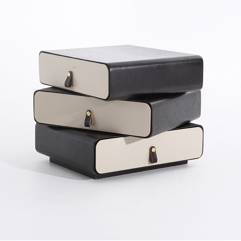 This modern creative bedside table features a unique 3-layer rotating drawer structure, combining artistic form with functional storage. Crafted from solid wood multilayer board with solid wood drawers, it ensures durability and long-term stability. The outer shell showcases a deep grey wood grain with a soft matte finish, paired with creamy beige drawer fronts for a modern contrast. Each drawer rotates smoothly, making it both a practical organizer and a statement design piece for modern bedrooms.