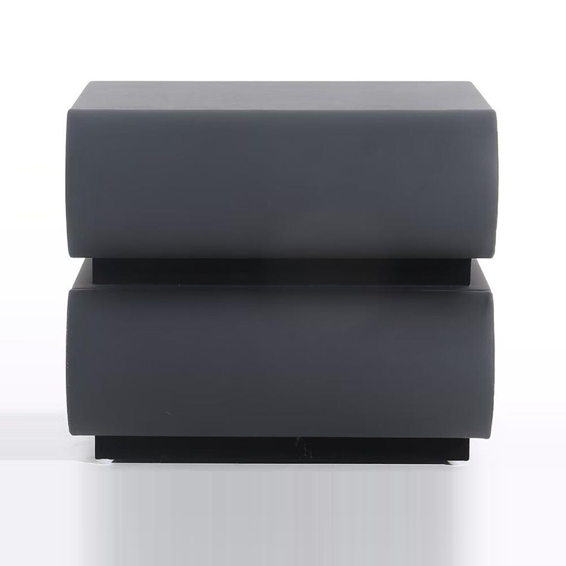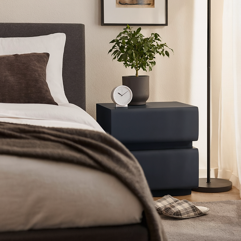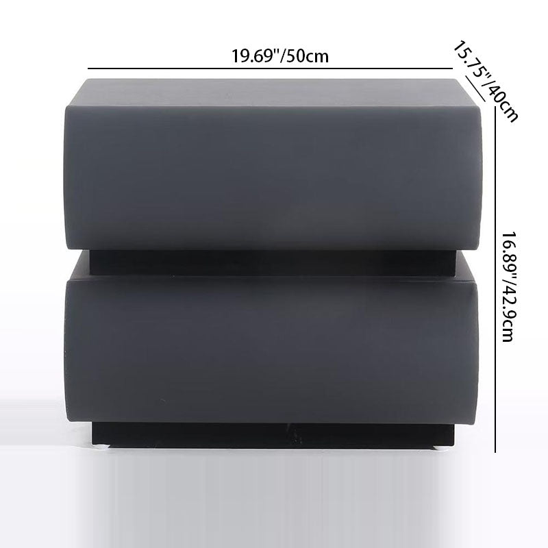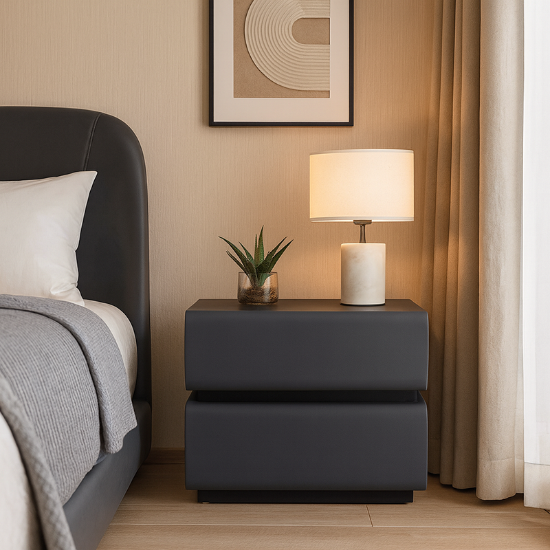 Elevate your bedroom with this modern minimalist nightstand, designed with clean geometric lines and a sculptural block silhouette. Wrapped in premium faux leather over an E1-grade engineered wood frame, it delivers a refined matte texture and soft-touch luxury. Dual push-open drawers provide seamless functionality, while solid-wood interior construction ensures long-lasting quality and smooth operation. Finished in deep charcoal grey, this piece effortlessly complements modern, japandi, industrial, and luxury interiors.