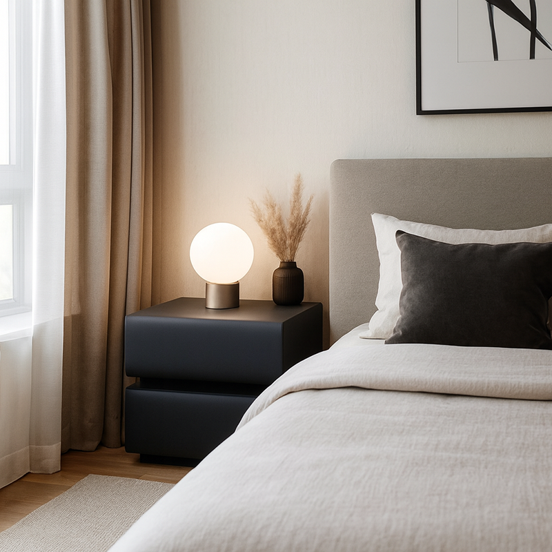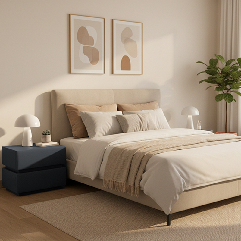 • Push-to-Open Storage: Two handle-less drawers maintain a seamless façade while keeping nightly essentials within reach.