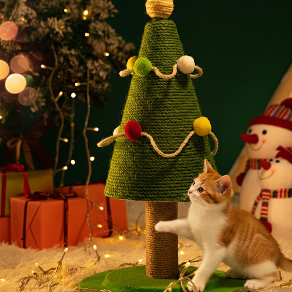This is a versatile, multifunctional space that meets all of your cat's needs: it features multi-level natural sisal scratching posts for healthy paw maintenance and a tucked-away, cozy cat nest for peaceful lounging. Available in classic, earthy green and brown tones, this tower offers ample space for climbing, scratching, and playing. Optimized for North American consumers searching for Christmas cat trees, festive pet furniture, sisal scratching posts with cat beds, and unique, themed cat condos for holiday home décor.