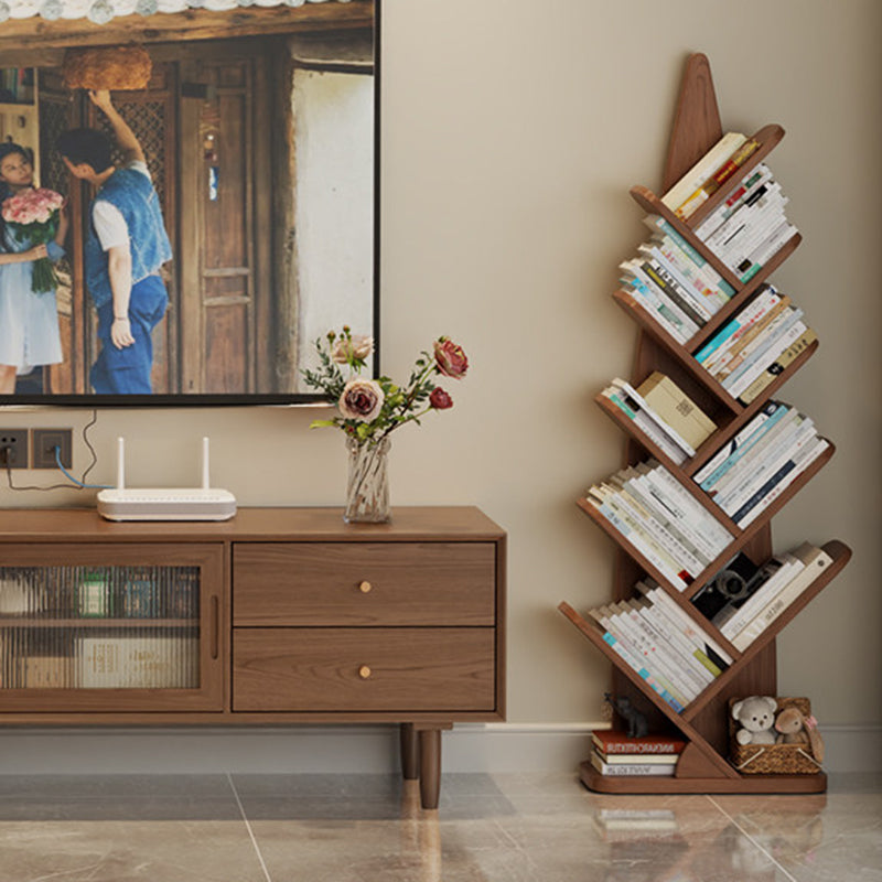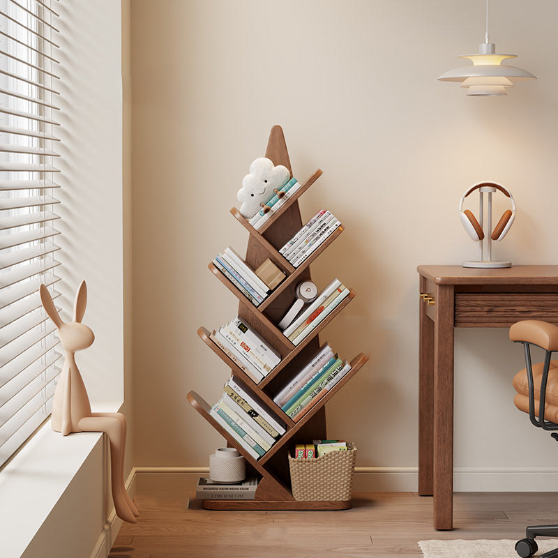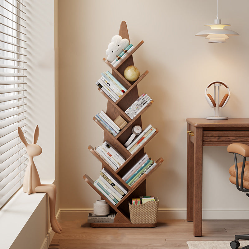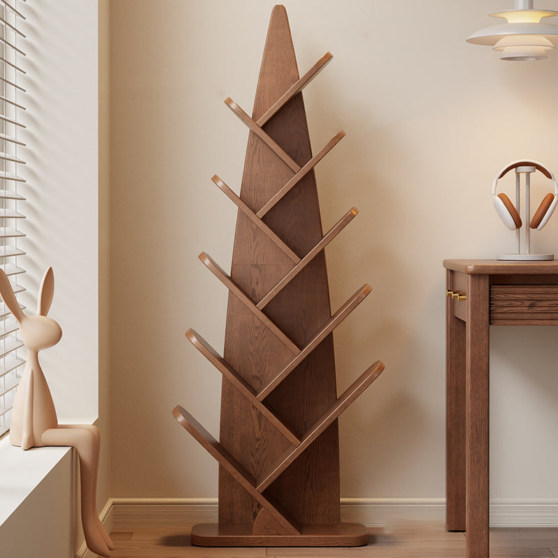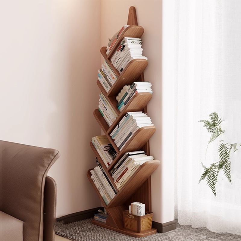 Crafted from durable solid rubberwood in a rich walnut finish, this bamboo-shaped bookshelf features an eye-catching staggered design with 8 or 10 open tiers for organized, easy-access storage. Its slim, floor-standing profile fits perfectly against walls or corners, making it a creative and space-saving bookcase for living rooms, bedrooms, or home offices.