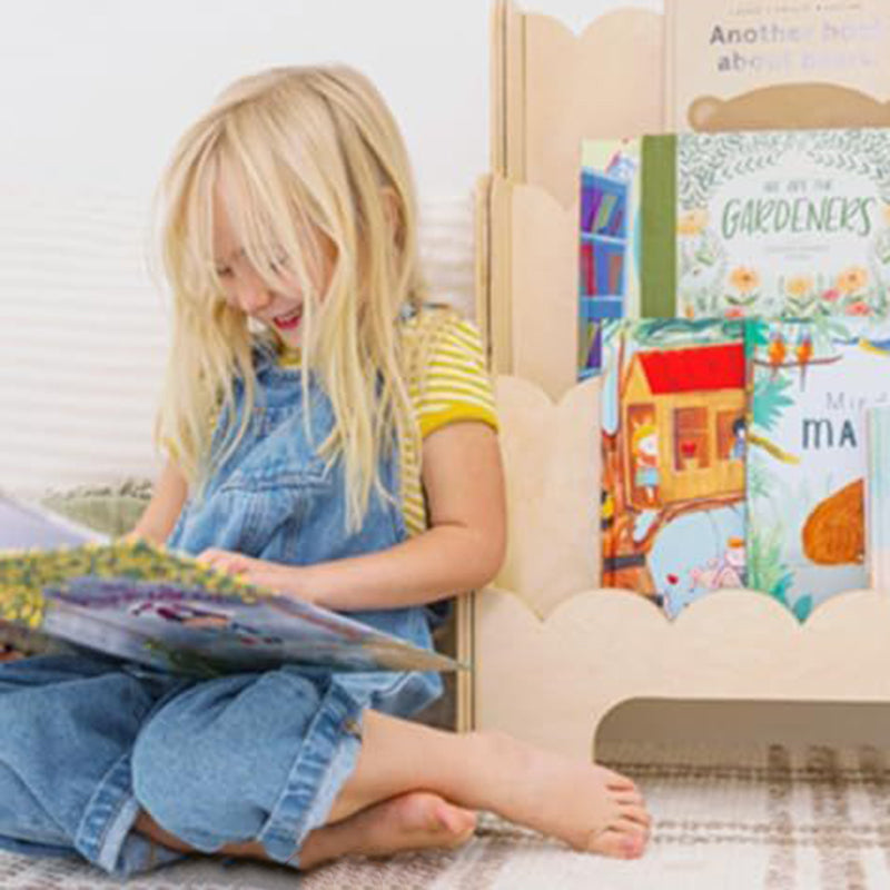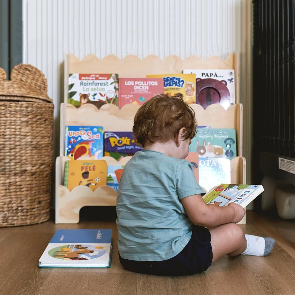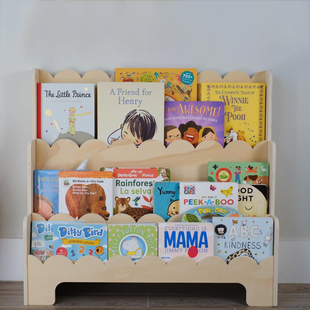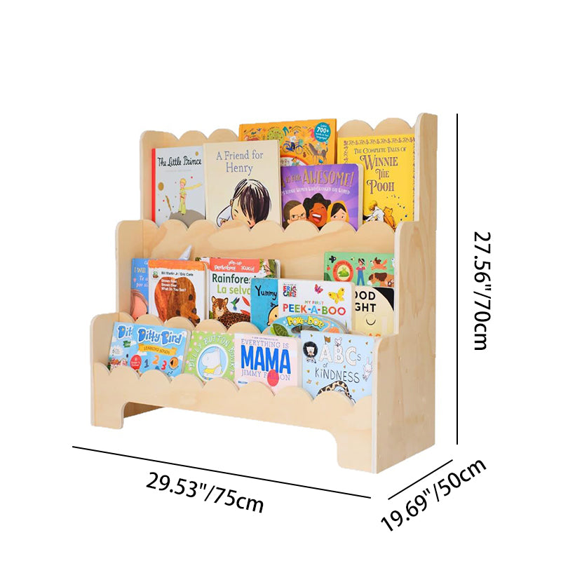 このモンテッソーリにインスパイアされた子供用本棚は、選ばれたパイン材のフレームと合板で作られた現代的な北欧スタイルを特徴とし、頑丈で長寿命です。3つの棚と自然な木の色の扇形デザインを備えたこの自立型本棚は、リビングルームや書斎で子供の本を整理するのに最適です。