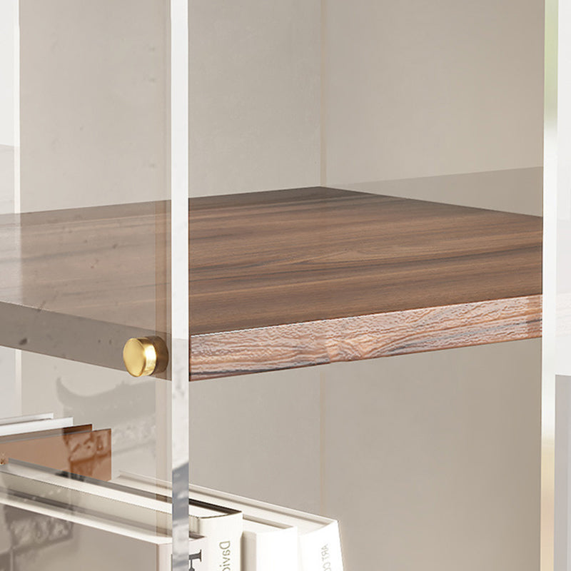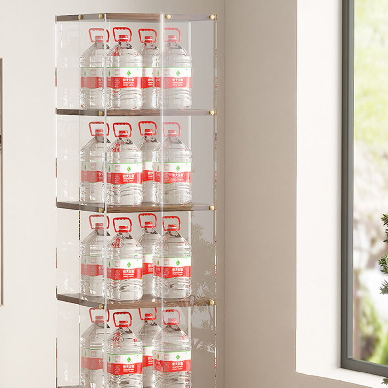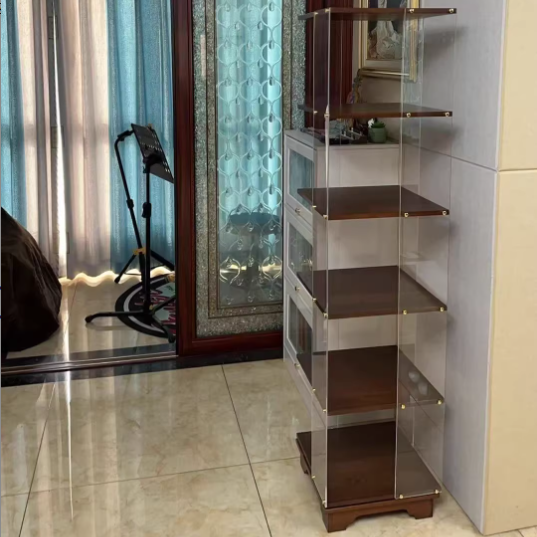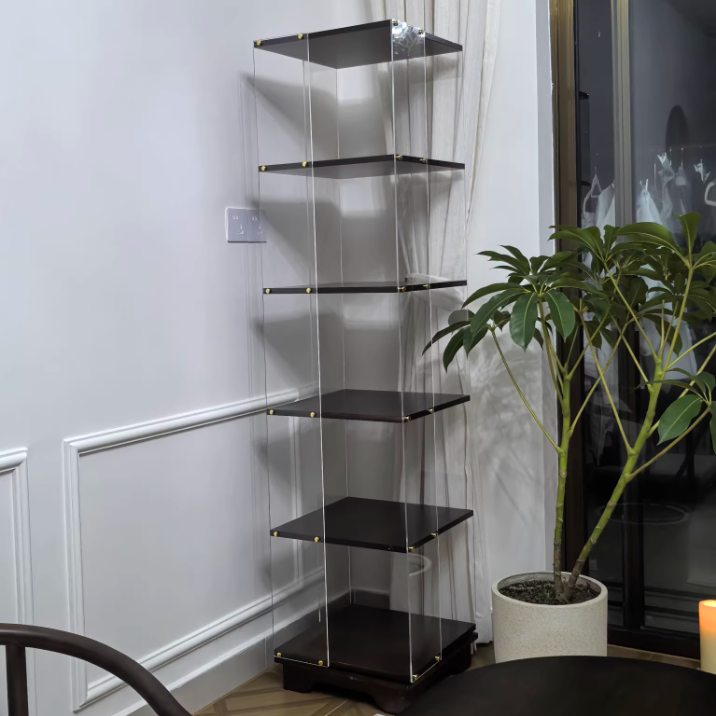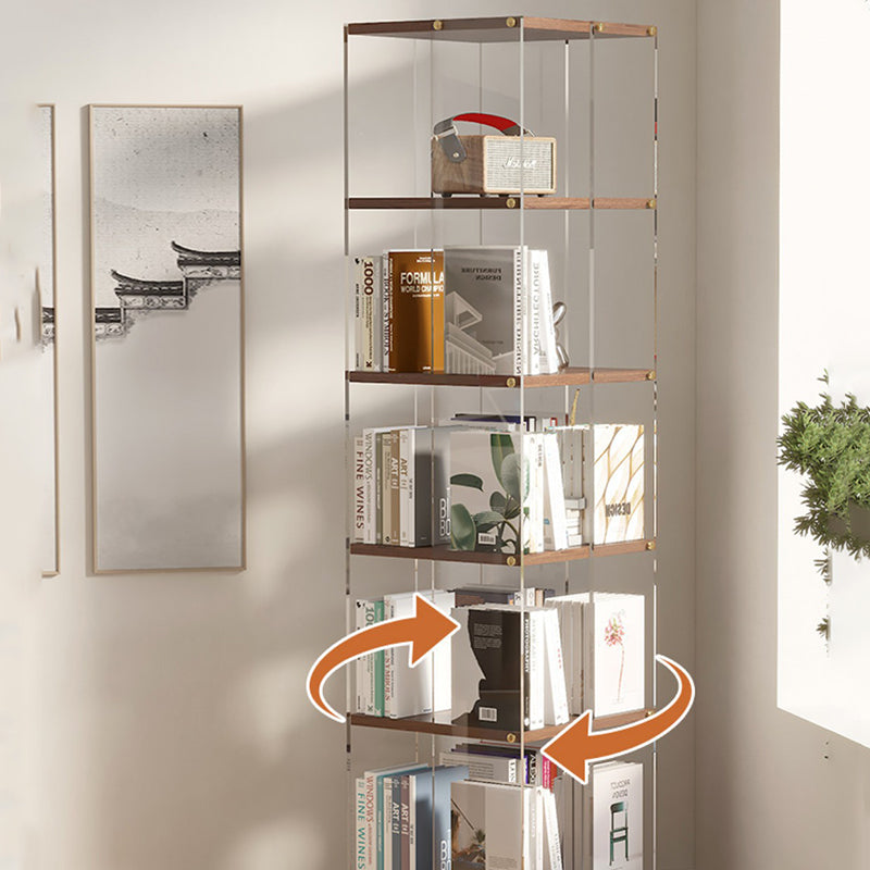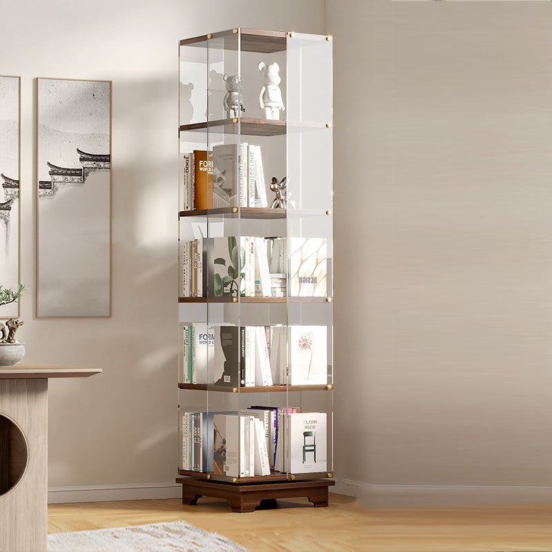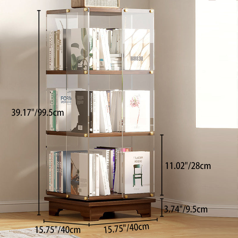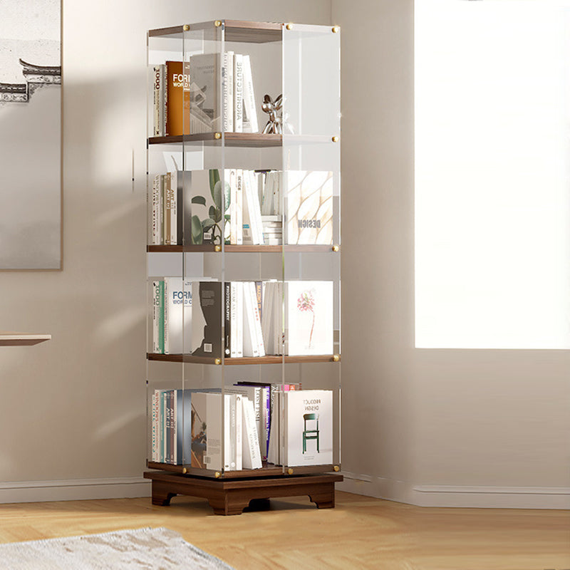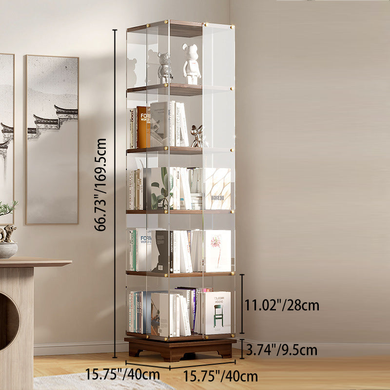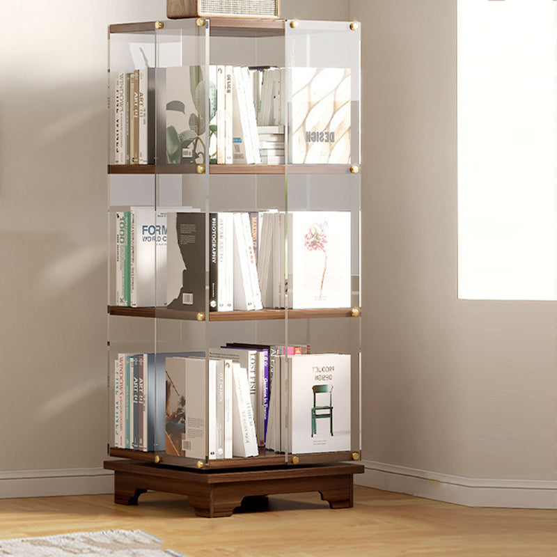 This modern minimalist rotating bookshelf features a square design crafted from clear acrylic and solid wood panels, offering 3 to 6 tiers of flexible storage. Finished in a warm walnut tone, its 360-degree free rotation allows easy access from any angle, making it a stylish and space-efficient storage solution for the living room or study.