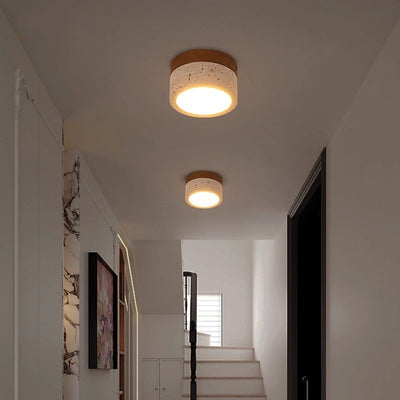 Modern Minimalist Round Solid Wood Yellow Travertine LED Flush Mount Ceiling Light For Entryway