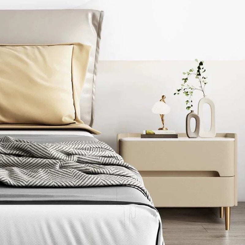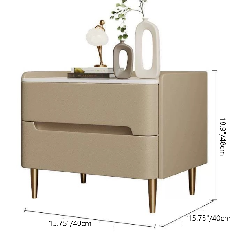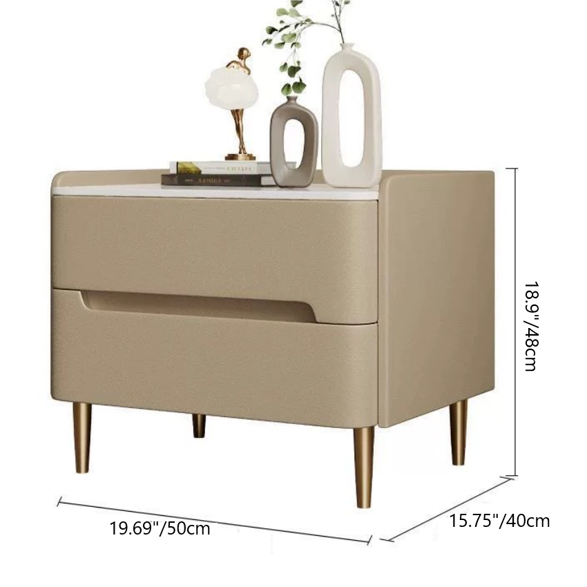 This modern nightstand features a sintered stone top with raised edges, paired with a smooth microfiber leather finish for a refined, durable look. Designed with two spacious drawers and sturdy metal accents, it offers practical storage in beige, khaki, and gray tones—perfect for contemporary bedrooms with a touch of Scandinavian elegance.