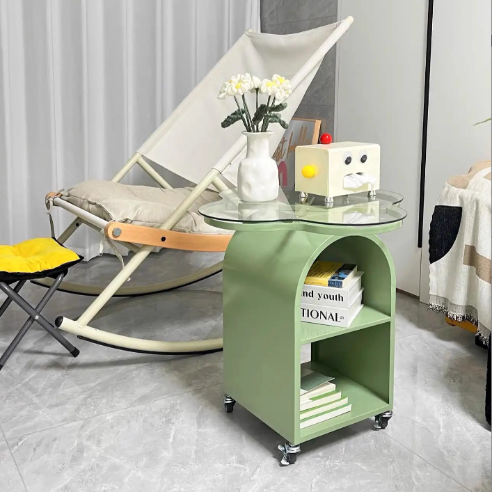 This Contemporary Creative side table features a unique flower arch design with durable tempered glass shelves and iron frame, offering 3-tier storage for drinks, books or décor. Equipped with smooth universal wheels, it is easy to move and available in off-white, black and green, making it a stylish and functional addition to any living room.