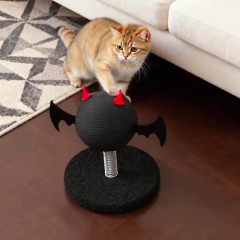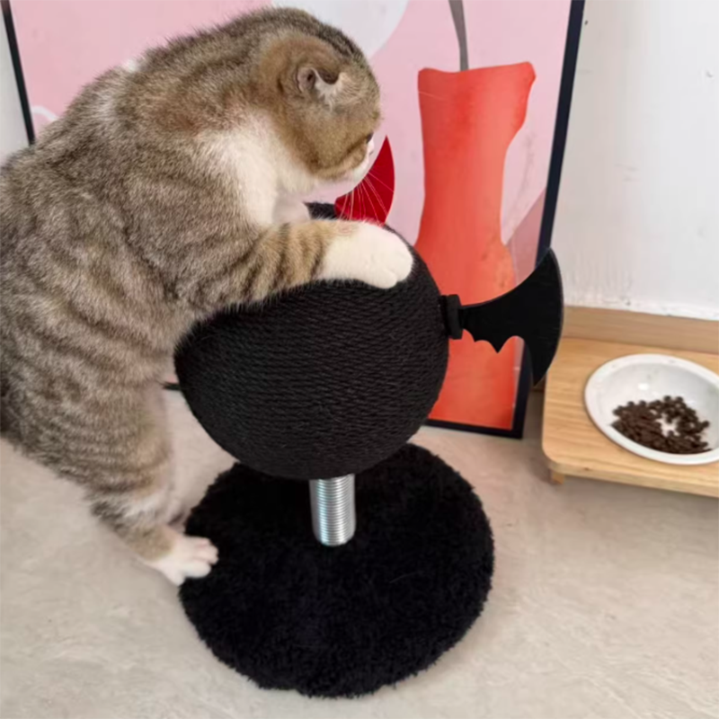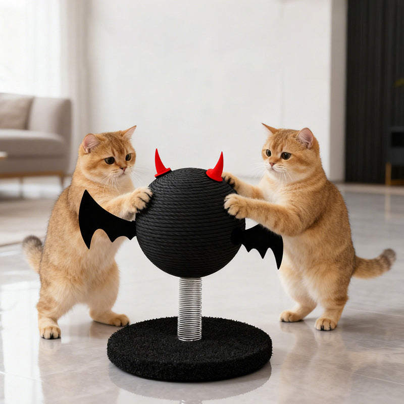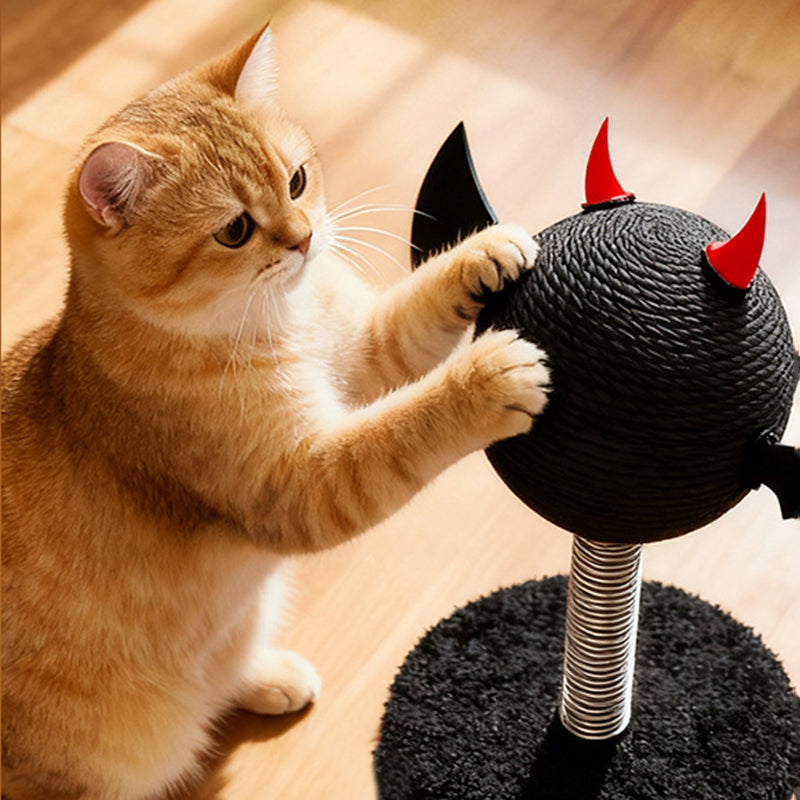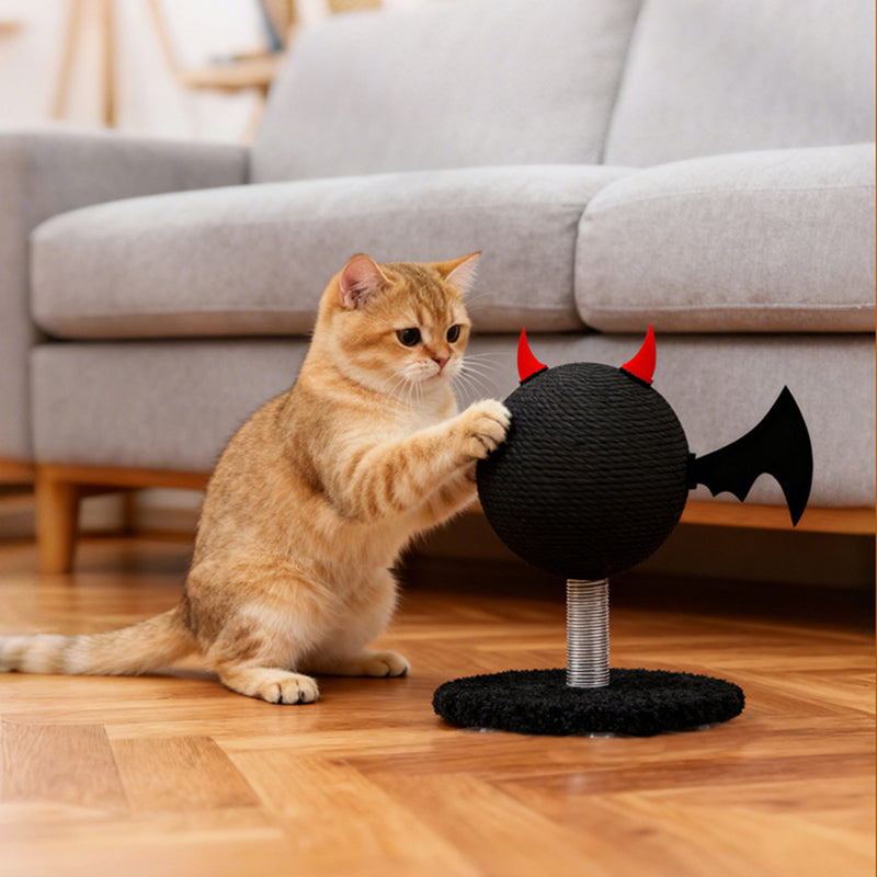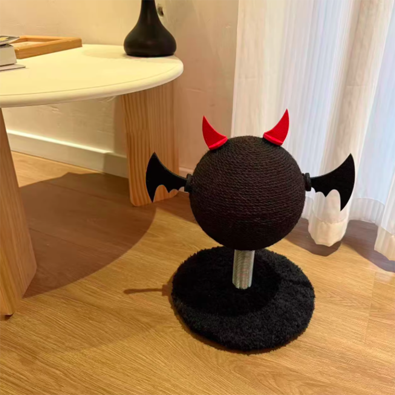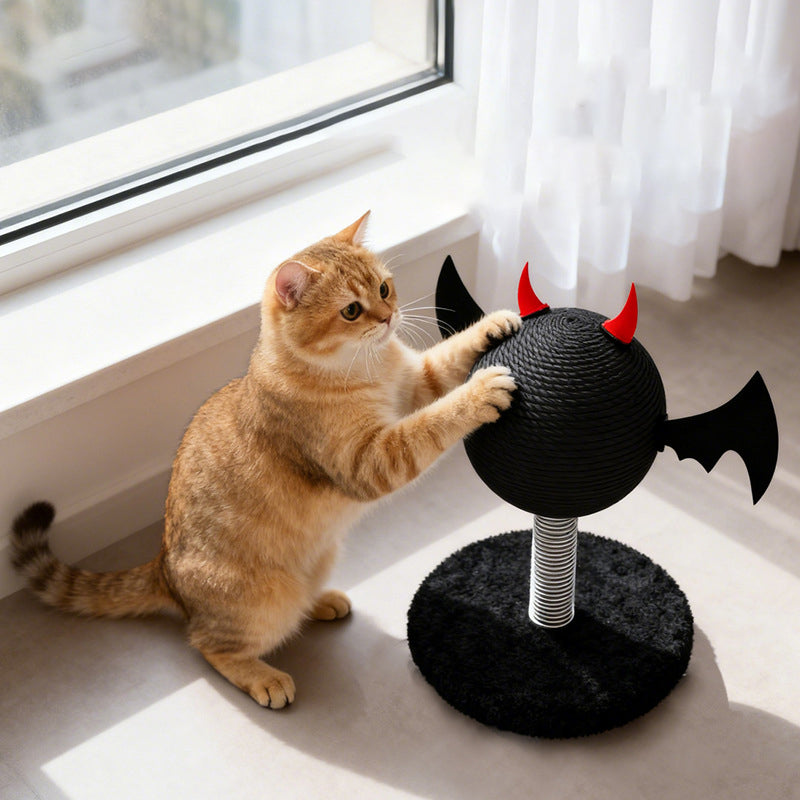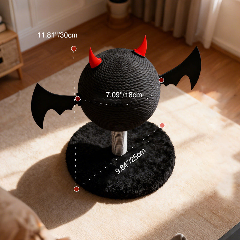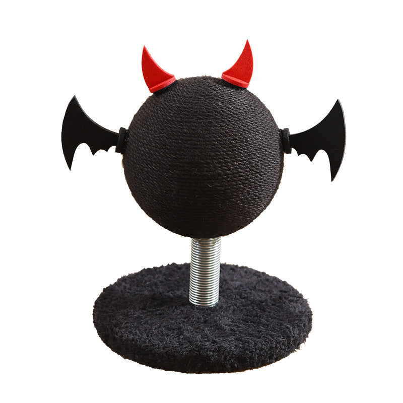 This black 1-level cat scratcher features durable sisal rope scratching surfaces, a plush-wrapped base for paw comfort, and a spring-mounted design that gently sways and rebounds for endless self-play. The cartoon devil bat design adds a fun, modern touch to your living room while supporting healthy scratching and active indoor cats.