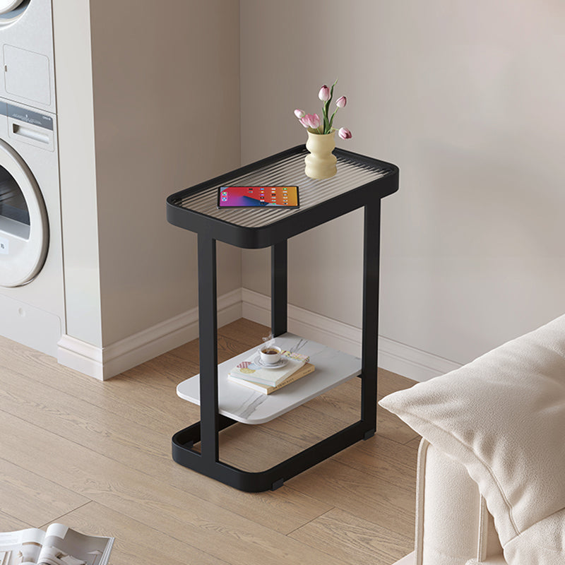 Contemporary Industrial Rectangular Carbon Steel Glass Rock Slab End Table 2 Tier For Living Room