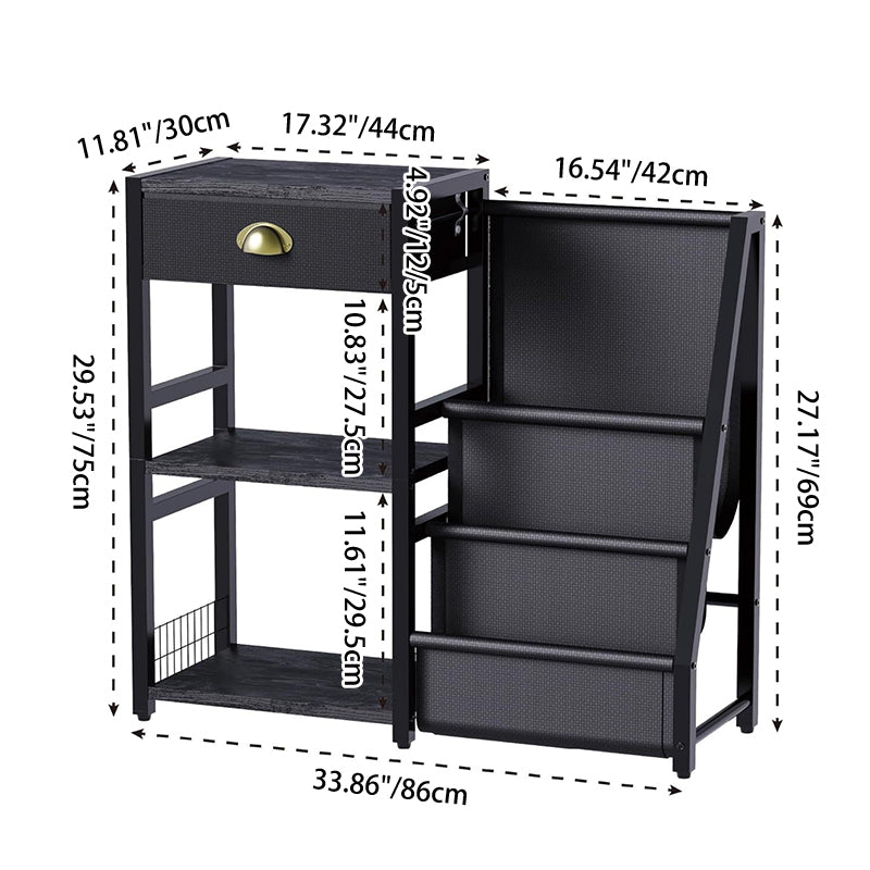 Organize your living room in style with this modern rectangular wood and metal storage cabinet. Featuring three tiers, a convenient drawer, and shelves in sleek black and camel tones, it offers versatile storage for records, books, or decorations while blending seamlessly with any minimalist interior.