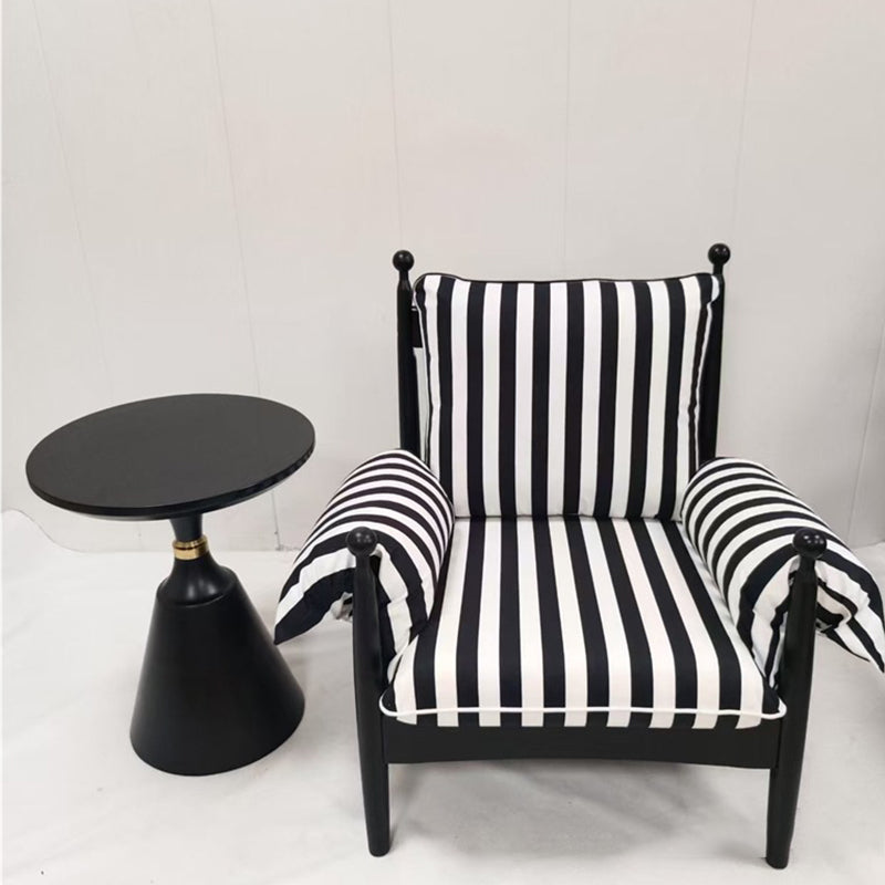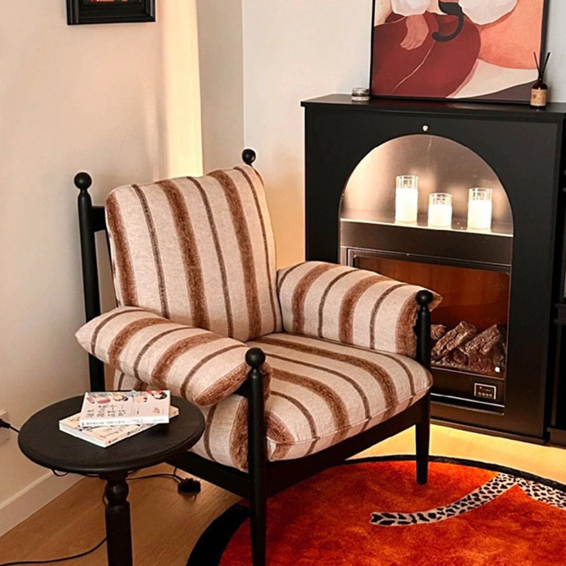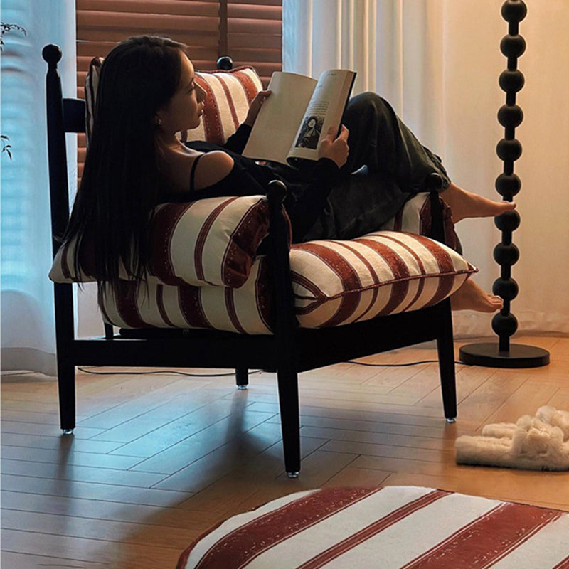 Bring a touch of timeless French charm to your living room with this vintage-style lounge chair. Made from soft cotton-linen fabric, solid wood, and plush PP cotton filling, it features a cozy cushioned seat, elegant armrests, and a supportive backrest—available in brick red, forest green, and black-white tones for a refined classic look.