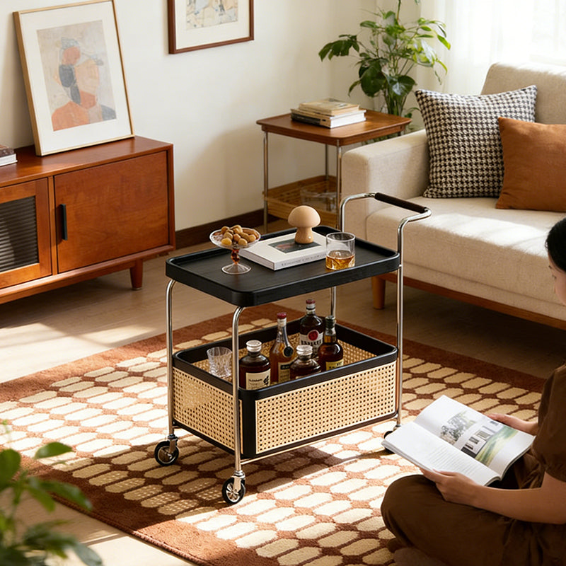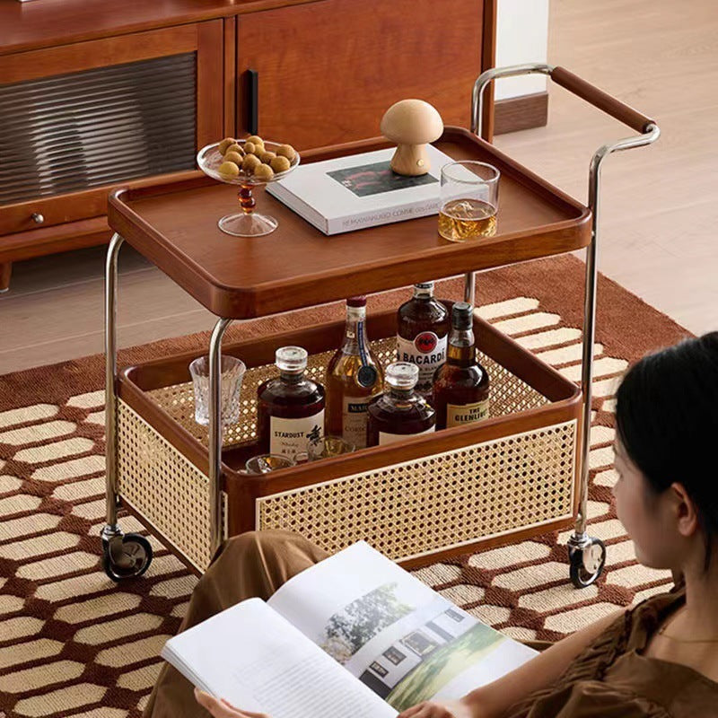 Experience timeless simplicity with this traditional Japanese-inspired cart-style side table. This highly versatile piece combines a durable solid wood frame with elegant woven rattan panels and subtle stainless-steel accents. Its compact 2-tier design offers functional storage and display space. Available in sophisticated walnut, cherry, or black finishes, the table features smooth 360° swivel casters and strong load-bearing stability, allowing it to serve effortlessly as a versatile rolling storage rack or a classic living room end table.