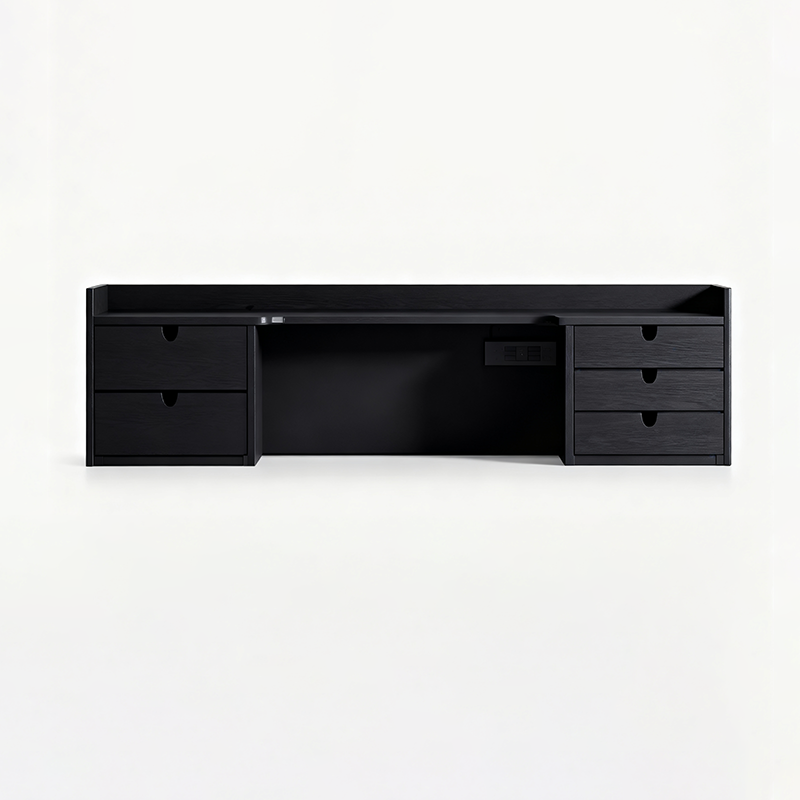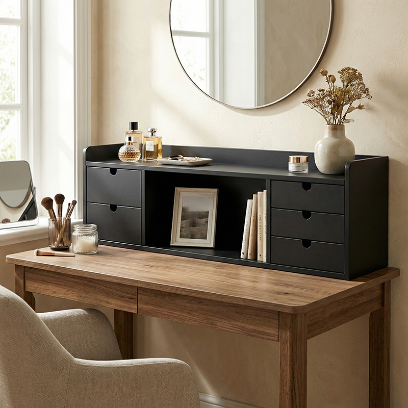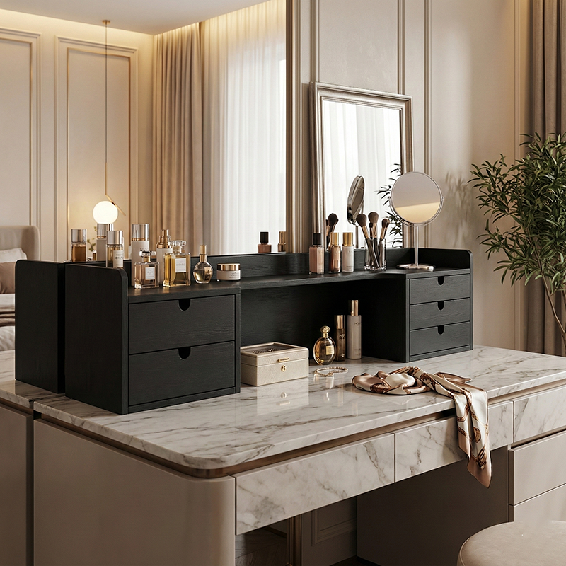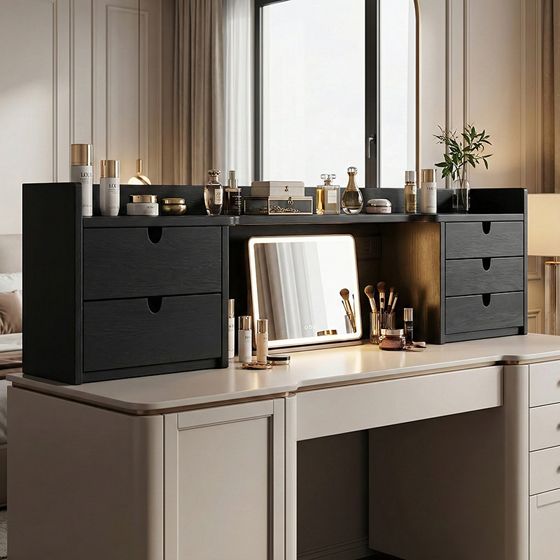 Boasting a modern minimalist design, this vanity storage shelf features a frame crafted from high-quality solid wood multi-layer board---sturdy, durable, and eco-friendly, setting the stage for a neat grooming routine. Five built-in drawers neatly organize cosmetics, skincare, and other beauty essentials, keeping your vanity clutter-free. Its all-black finish and sleek lines seamlessly complement any minimalist vanity space, cementing it as a stylish, functional staple for your grooming moments.