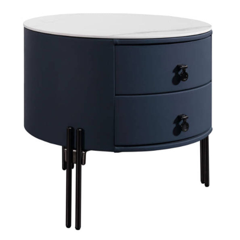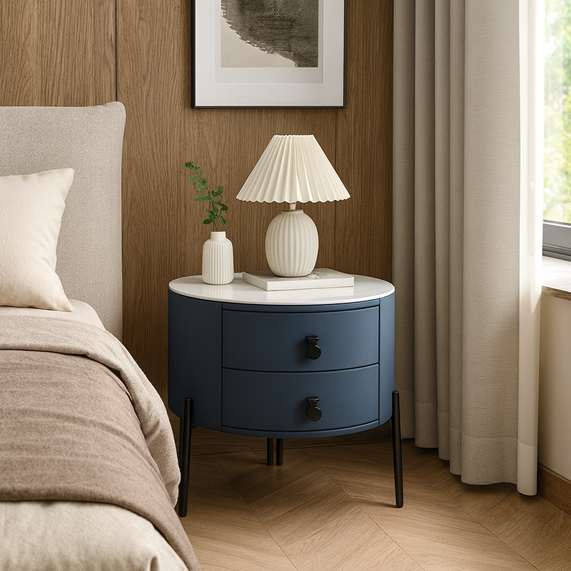 This contemporary Nordic nightstand blends clean geometry with soft curves for a refined, elegant look. Featuring a sintered stone top and faux leather finish, it combines durability with sophistication. The dual-drawer design offers functional storage, while metal cylinder legs add a sculptural modern edge. Perfect for modern, minimalist, or Scandinavian interiors.
