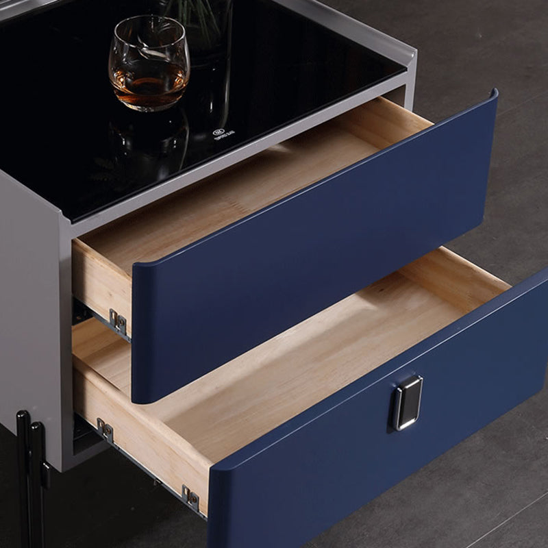 This contemporary industrial-style nightstand features a sturdy E1 eco-board frame, a tempered glass top that's transparent and easy to clean, solid wood drawers with strong load-bearing capacity. Matched with stainless steel legs and exquisite baking paint craftsmanship, it showcases detailed quality in its edgy style. The double-drawer design creates exclusive storage space for bedtime items. The material collision of metal, wood, and glass makes it a trendy statement piece in the bedroom, injecting unique industrial aesthetics into your living space.