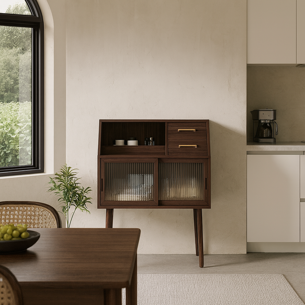 This modern minimalist sideboard features a sturdy pine frame with multi-layer solid wood panels, offering excellent load-bearing strength, moisture resistance, and large-capacity storage. Designed in a sleek trapezoid shape with cherry wood or walnut finishes, it includes 2 drawers and 2 cabinets to keep living or dining spaces neatly organized. Perfect for compact homes needing stylish and functional storage.
