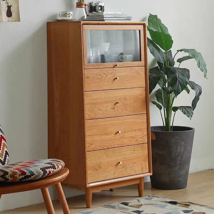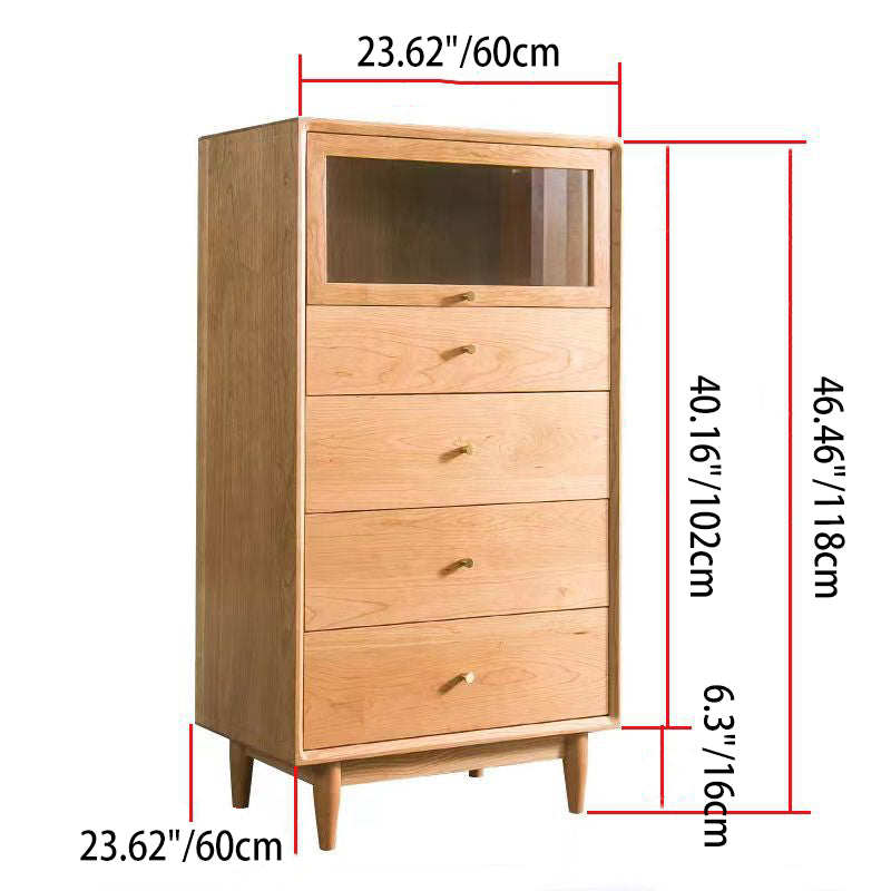 This modern trapezoid sideboard features a durable pine wood frame with an eco-friendly multi-layer wood back panel, offering four spacious drawers and one open cabinet for organized storage. Finished in a warm cherry wood tone with a sleek glass detail, it’s an ideal storage solution for living rooms or dining spaces. A stylish, sturdy, and functional piece designed for everyday home organization.
