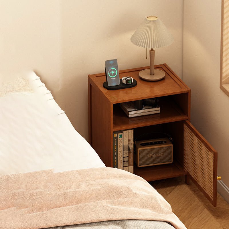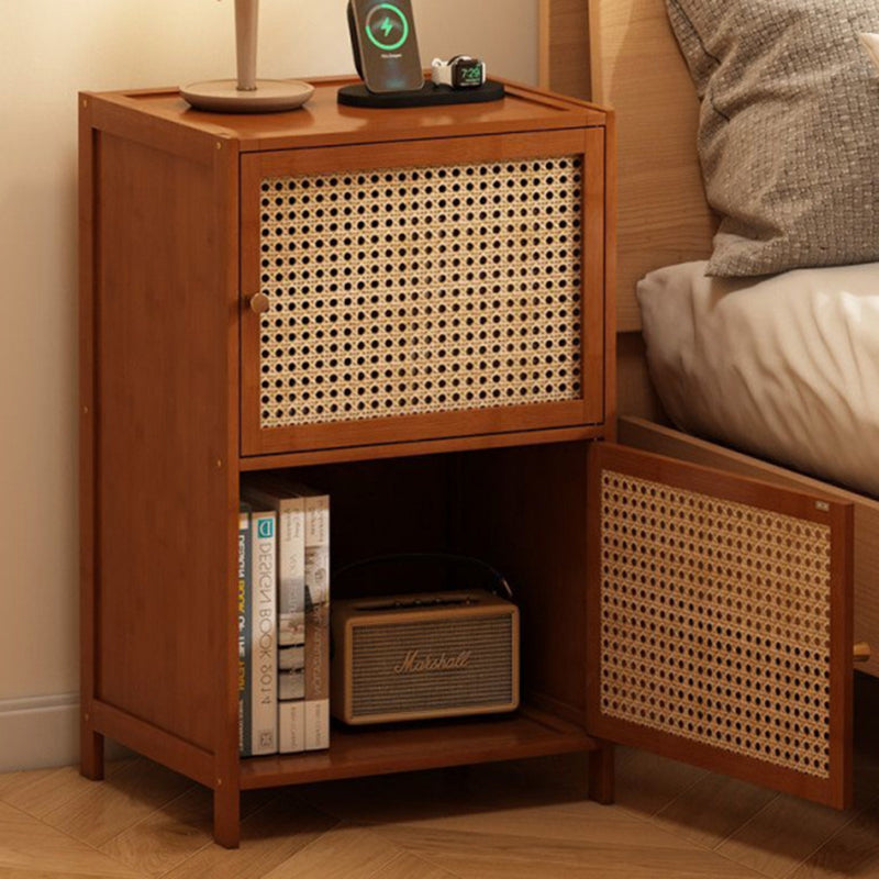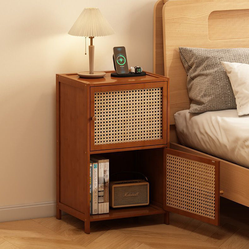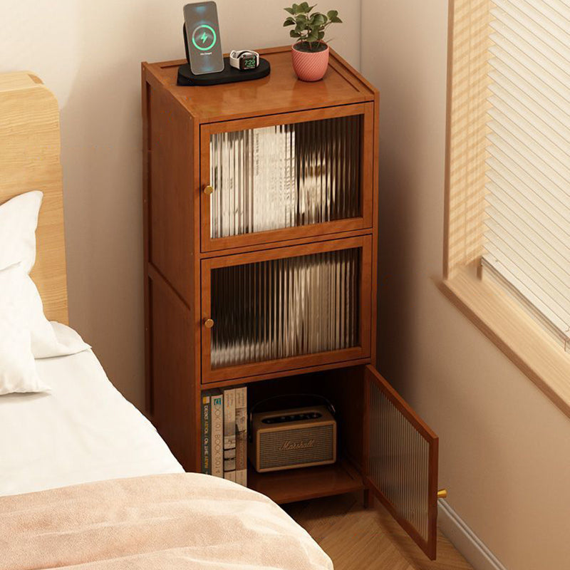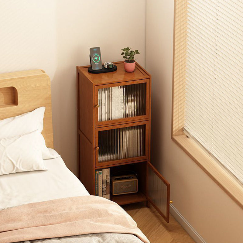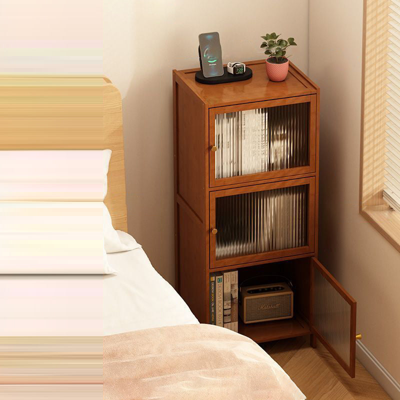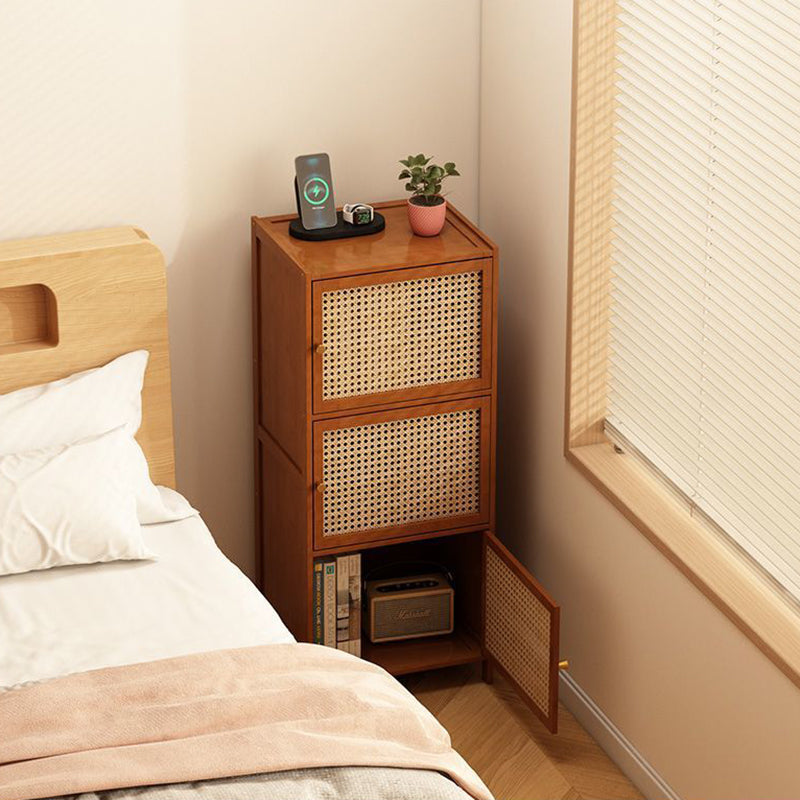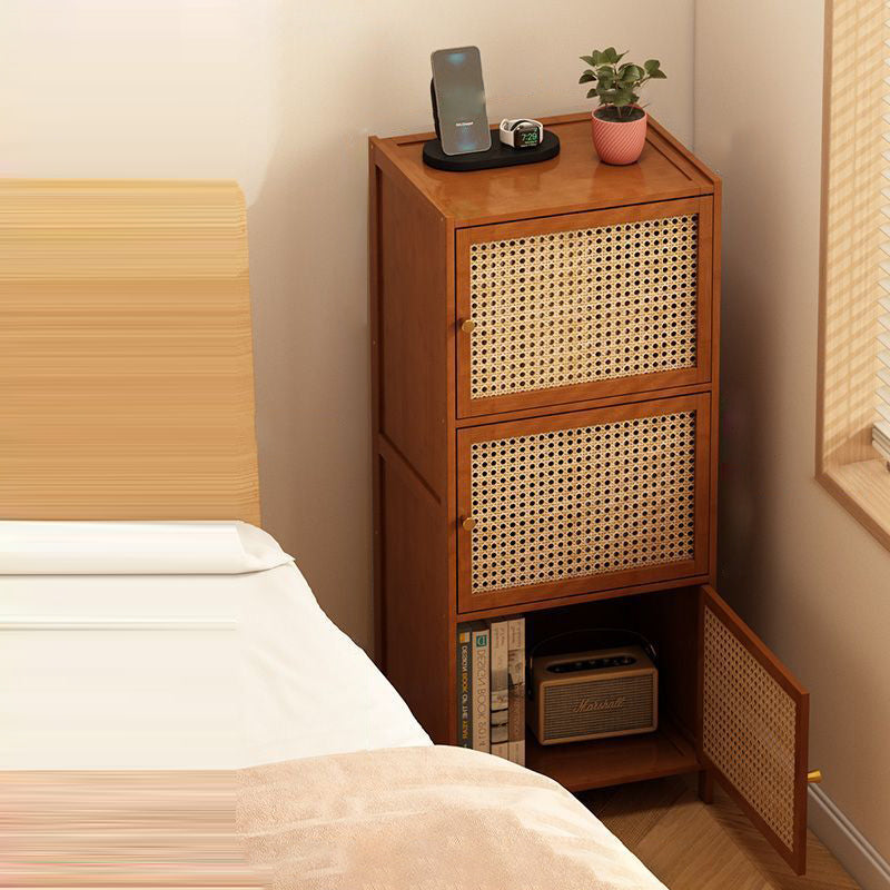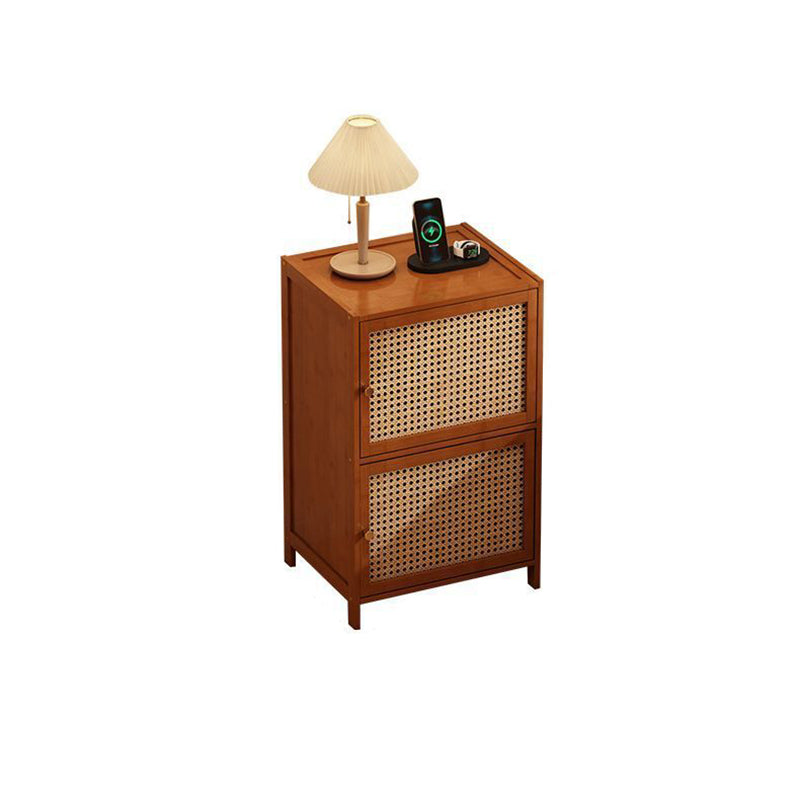 This modern minimalist storage cabinet features a rectangular bamboo frame, MDF full name: Medium-Density Fiberboard, acrylic panels, and rattan accents, offering 1/2/3-cabinets cabinet-style storage in a warm vintage brown tone. Its wide tabletop, three-sided sealed design, and versatile layered structure provide practical bedside organization ideal for any bedroom layout.
