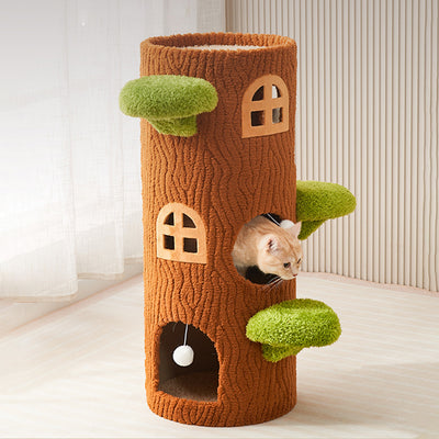 This multi-level structure provides ample space for climbing, scratching, and tranquil lounging, accommodating large or multi-cat households with ease. Anchored by a stable solid wood base, the tree adds a touch of natural charm and enduring durability to your living room. It’s the ultimate feline playground that seamlessly complements a clean, contemporary interior.