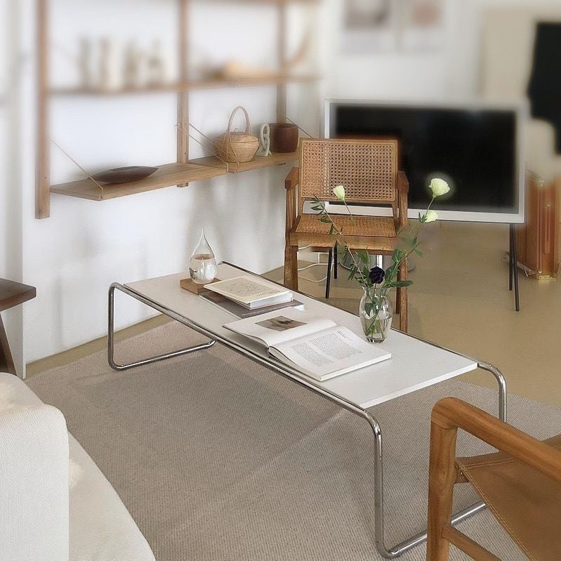 This modern minimalist rectangular coffee table combines stainless steel and MDF for a sleek, durable design. Available in black and white, its stable structure and Nordic-inspired style make it perfect for dining rooms, living areas, or contemporary cafe spaces.