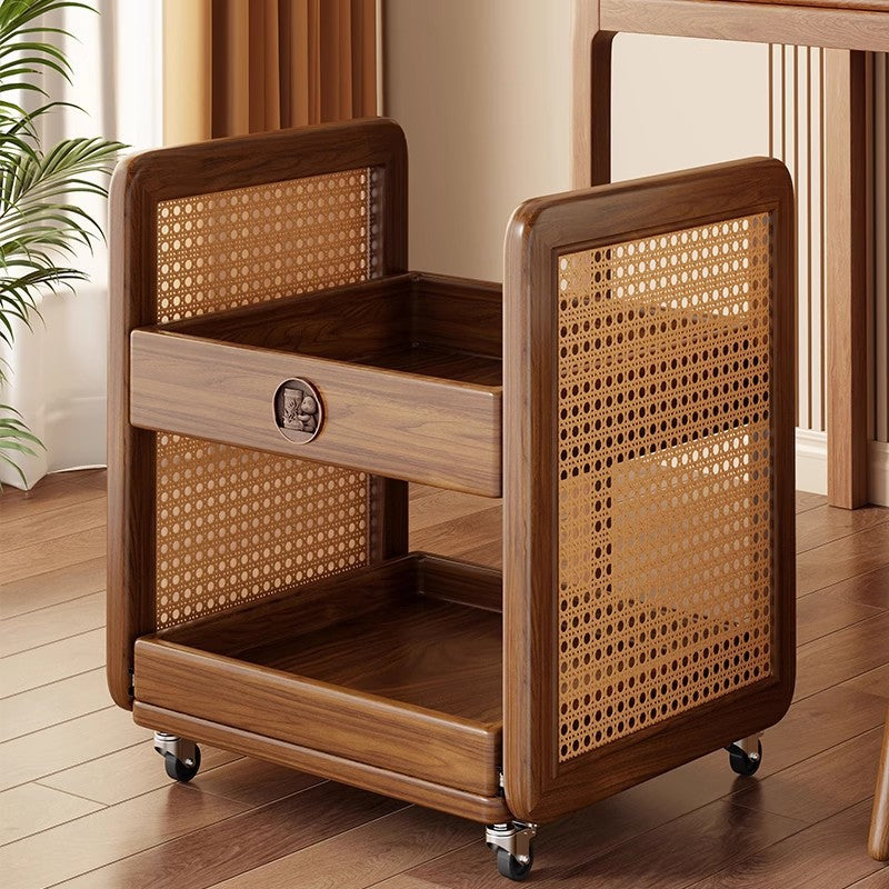 ソリッドラバーウッドと籐編みのアクセントで作られたこの伝統的なヴィンテージサイドテーブルは、2段の収納を備えた丸みを帯びた四角いデザインが特徴です。ウォールナット仕上げ、滑らかな引き出し、自然な木目が、リビングルームやオフィススペースにスタイリッシュで機能的な収納ソリューションを提供します。